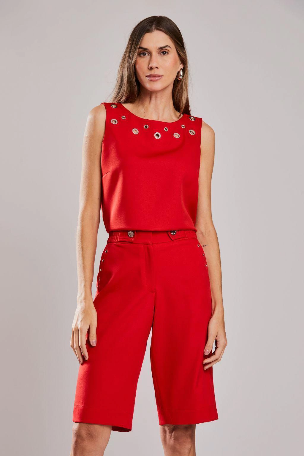 Combine a Bermuda de Alfaiataria Ilhos Business Vermelho com uma blusa de seda para um look profissional e refinado ou use-a com uma camiseta básica e tênis para um visual casual e moderno. Os detalhes em níquel nos aviamentos adicionam um toque de sofisticação que pode ser complementado com acessórios discretos.