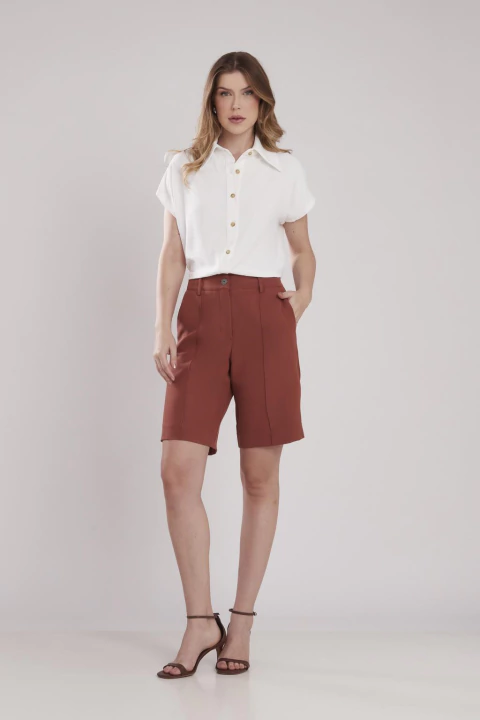 A Bermuda de Alfaiataria da Rubinella é a escolha perfeita para quem busca elegância e conforto em uma peça versátil para o dia a dia. Com modelagem de alfaiataria reta, comprimento clássico acima do joelho e cintura média, ela valoriza a silhueta com caimento estruturado e sofisticado.Confeccionada em tecido de toque macio, a peça apresenta pregas frontais sutis, que conferem acabamento refinado, além de bolsos funcionais e fechamento tradicional com botão e zíper. A barra com dobra larga reforça o visual elegante, tornando a bermuda ideal para composições urbanas, looks de trabalho ou produções mais casuais com sofisticação.