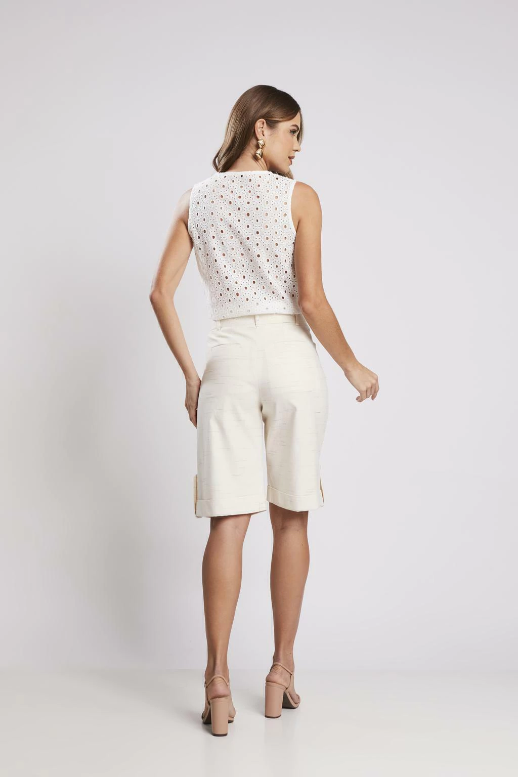 Combine a Bermuda Reta Risca Única com regatas para um visual fresco e despojado, ou opte por camisas leves para um toque mais sofisticado. Durante as transições de estação, um tricô leve pode ser a escolha ideal para completar o look. Explore também estilos como romântico ou esportiva casual para diversificar suas produções.