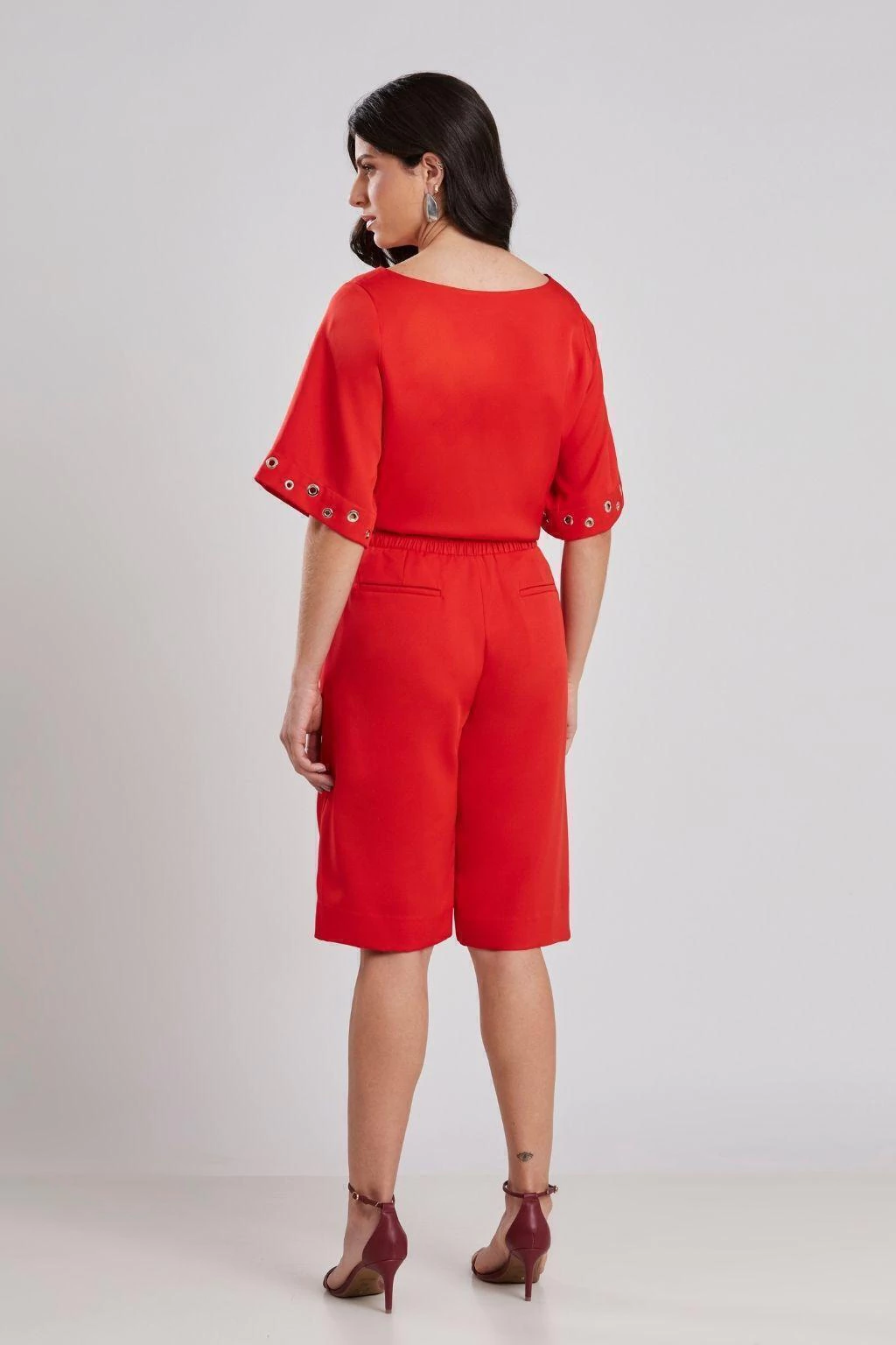 A Blusa da Rubinella traduz elegância moderna com toque utilitário. Confeccionada em alfaiataria leve, apresenta gola arredondada, mangas curtas e amplas, e um caimento impecável que valoriza o visual clean e contemporâneo.O grande destaque fica por conta dos ilhoses metálicos aplicados nas mangas, que trazem contraste e personalidade em níquel nas versões azul e vermelha, e ônix na versão preta. Uma peça sofisticada que combina perfeitamente com produções urbanas e refinadas. Composição: 92% poliéster 8% elastano