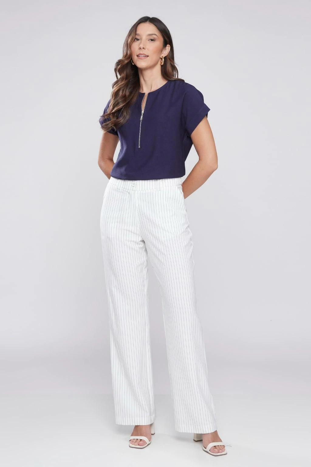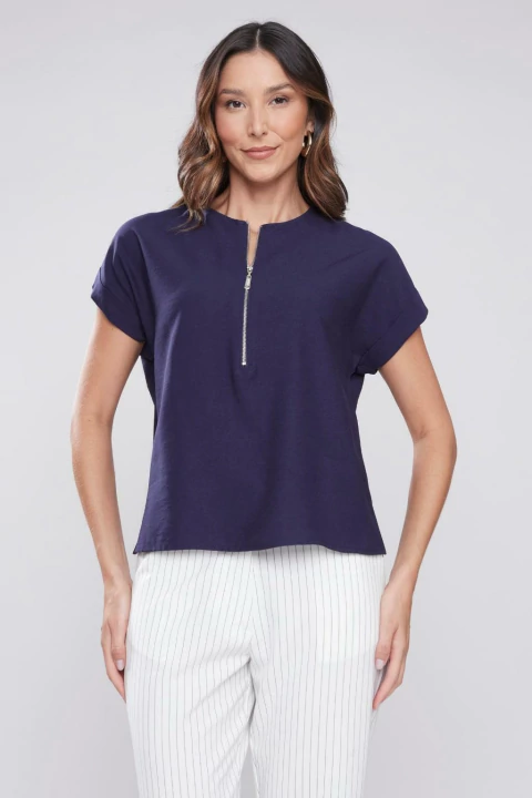 Combine a Blusa Básica com Zíper Marinho com calças de alfaiataria para um look sofisticado, ou use-a com jeans para um visual mais casual e descontraído. A peça também fica incrível com saias midi, criando um contraste elegante e moderno.