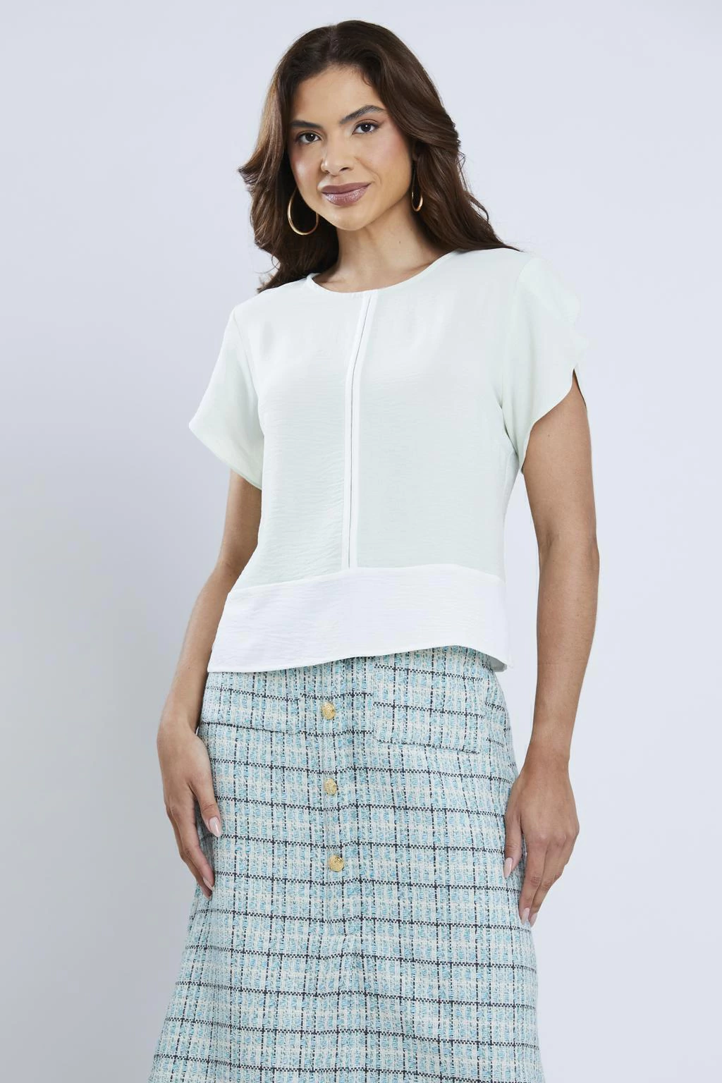 Combine a Blusa Bicolor Orvalho com uma saia midi para um look sofisticado de escritório ou com jeans e sapatilhas para um visual casual e descontraído. Adicione acessórios delicados para um toque de charme e modernidade.