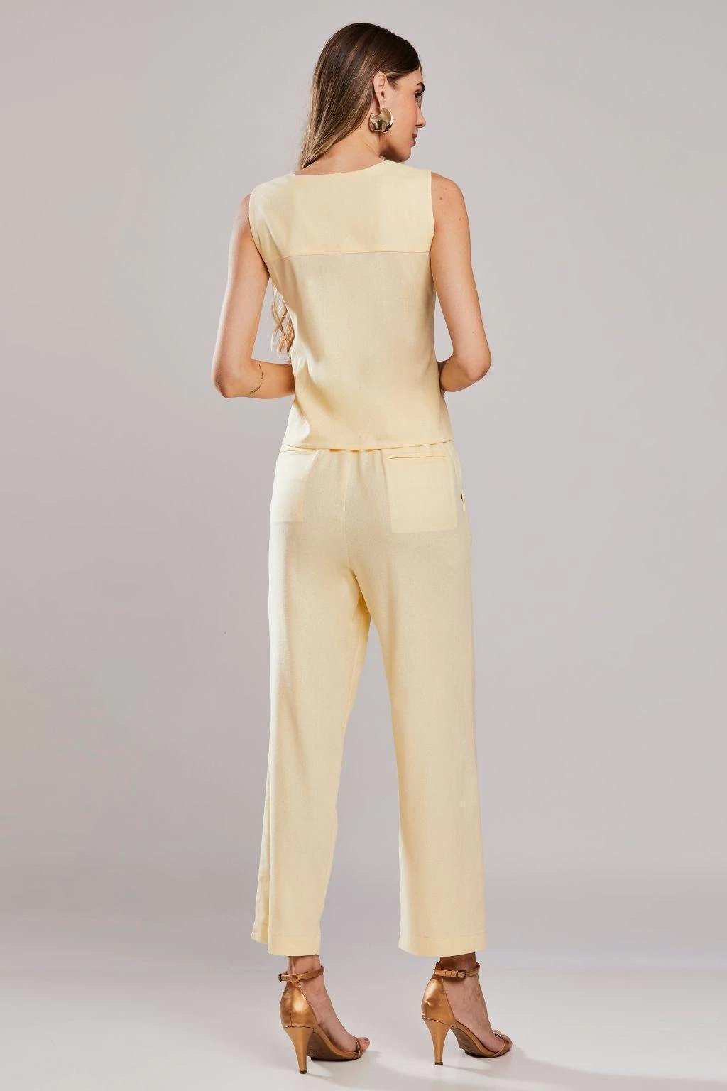 Para um visual elegante, combine a Blusa Corset Alfaiataria Amarelo Claro com uma saia midi plissada e sapatos de salto. Para um look mais casual, experimente usá-la com jeans de cintura alta e tênis brancos. Não se esqueça de adicionar acessórios minimalistas para completar o visual com um toque moderno.