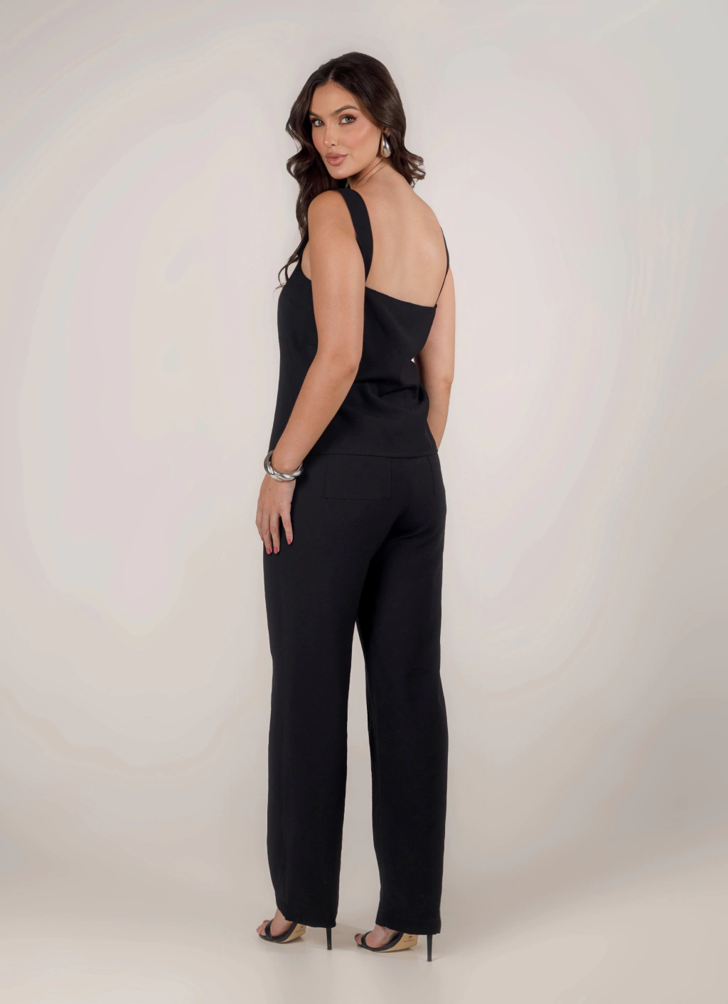 A Blusa Curta de Alfaiataria Preta da Rubinella é uma peça essencial para quem busca elegância e modernidade em um único look. Feita com uma composição leve de viscose (91%) e poliéster (9%), esta blusa se destaca pelo seu caimento sofisticado e pelos detalhes únicos. O decote reto e as alças largas trazem conforto e estilo, enquanto os botões tricolores luxuosos adicionam um toque de glamour. Ideal para ocasiões formais ou um dia no escritório, a blusa pode ser combinada com saias de alfaiataria ou calças para criar um visual impecável.