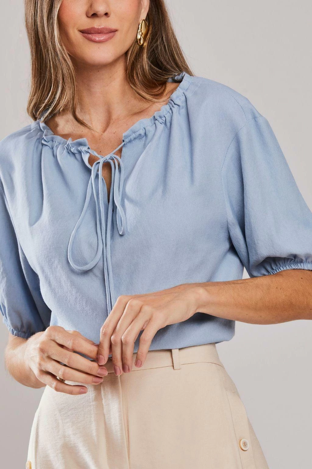 Combine a Blusa Decote Arredondado Slub Azul Bebê com uma saia midi e sandálias para um look sofisticado, ou use-a com jeans e tênis para um visual casual e moderno. A amarração na gola permite diferentes maneiras de usar, oferecendo ainda mais opções para o seu guarda-roupa.
