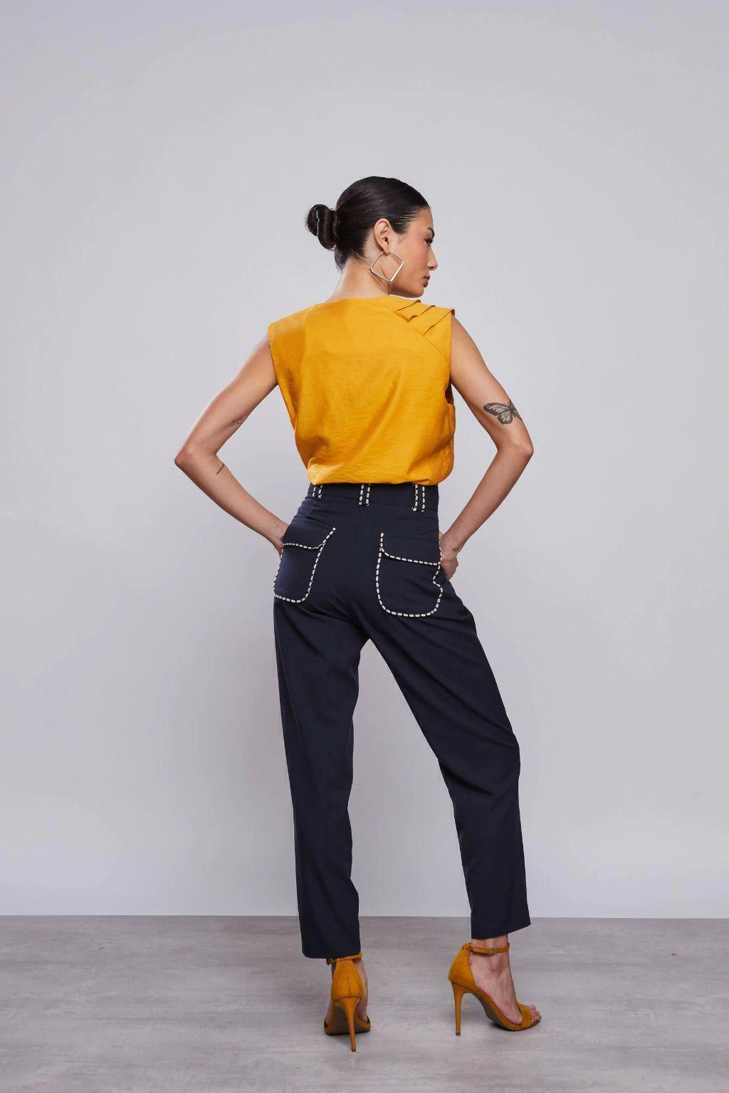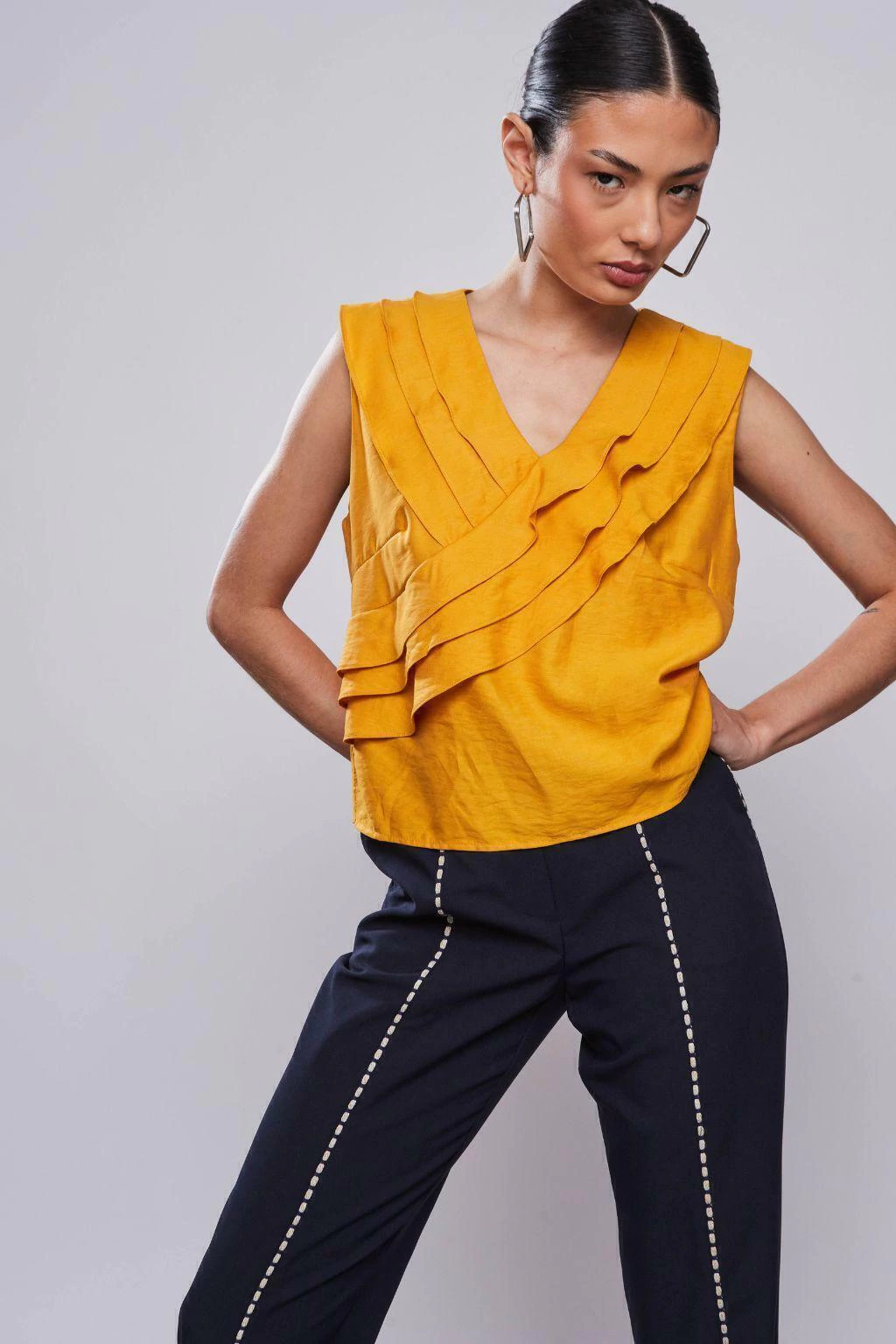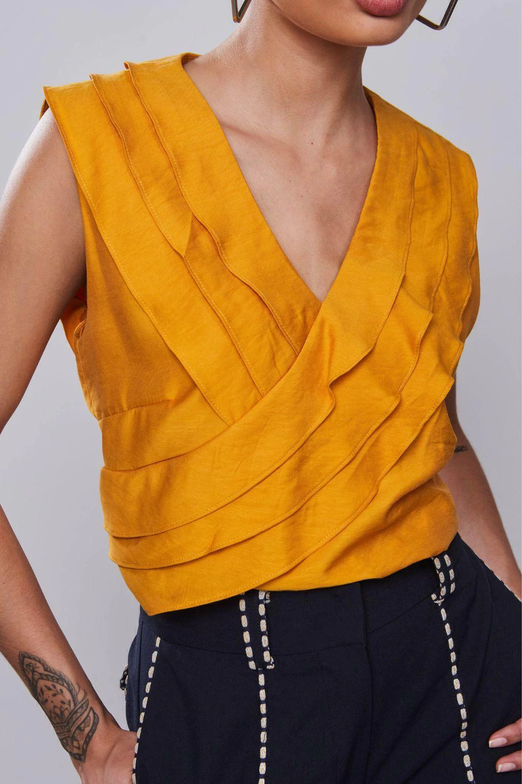 Combine a Blusa Pregas Viscose Mostarda com uma calça de alfaiataria para um look sofisticado, ou use com jeans para um visual casual e descontraído. Complete o look com acessórios em tons neutros para um toque moderno.