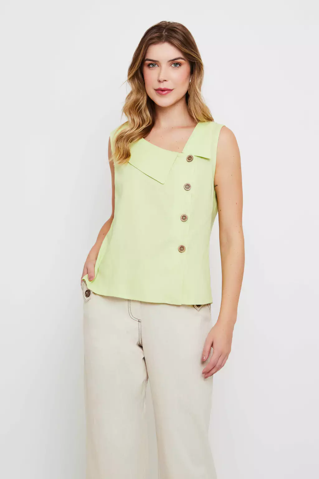A Blusa Sem Manga Transpassada Verde Claro da Rubinella é uma peça que combina elegância e modernidade. Confeccionada em visco linho Marquesa, essa blusa oferece um toque suave e um caimento impecável. Seu design transpassado com decote assimétrico e lapelas adiciona um toque de sofisticação, tornando-a uma escolha perfeita para diferentes ocasiões. Os botões em formato de flor e tom amadeirado são detalhes que realçam a exclusividade da peça.