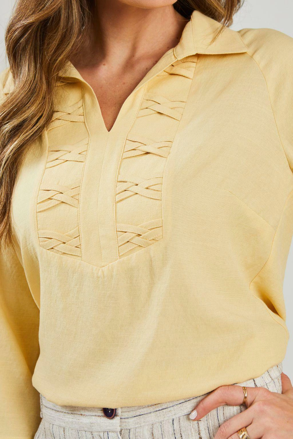 A Blusa Tranças Viscose Amarelo Claro da Rubinella é a adição perfeita ao guarda-roupa de mulheres que buscam estilo e conforto em uma única peça. Adicione ao seu carrinho agora e destaque-se com esta blusa única e versátil da coleção!