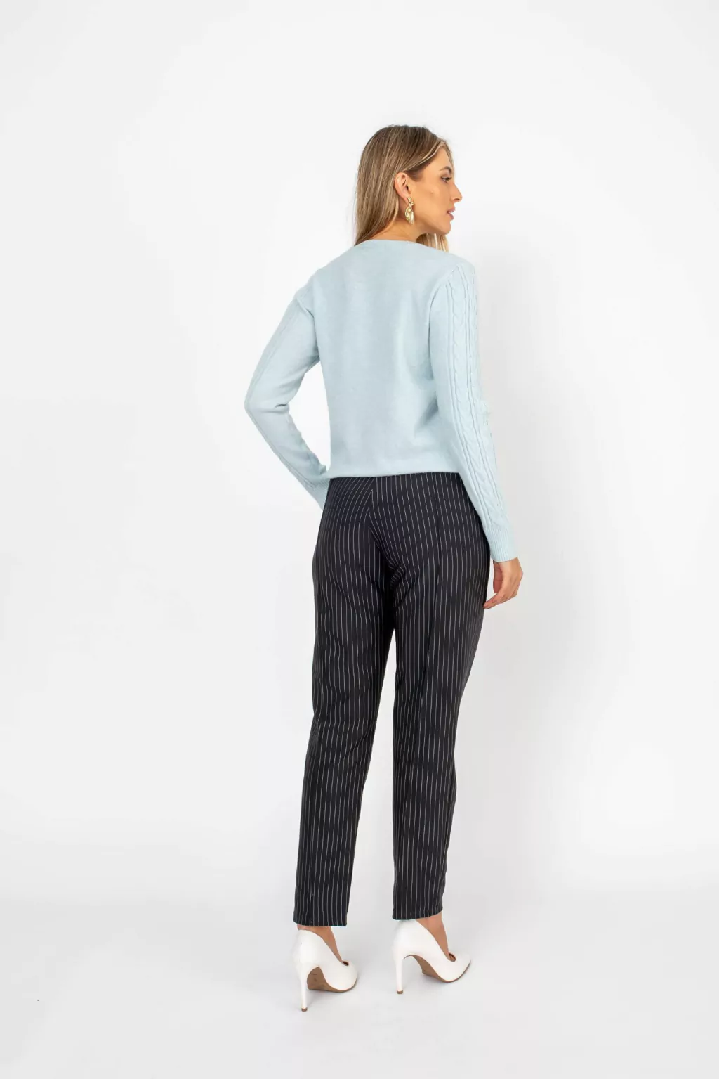 A blusa de tricot feminina canelada se destaca por seu design atemporal e versátil. A cor azul céu adiciona um toque de frescor e sofisticação, permitindo diversas combinações com outras peças do seu guarda-roupa. As mangas longas e a gola normal conferem um visual clássico e elegante, enquanto a modelagem larga garante conforto e liberdade de movimento.