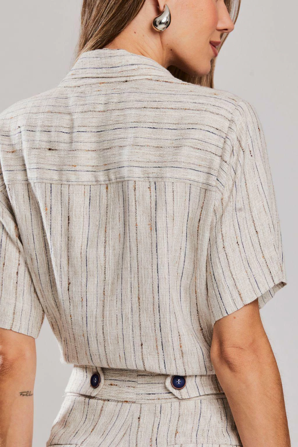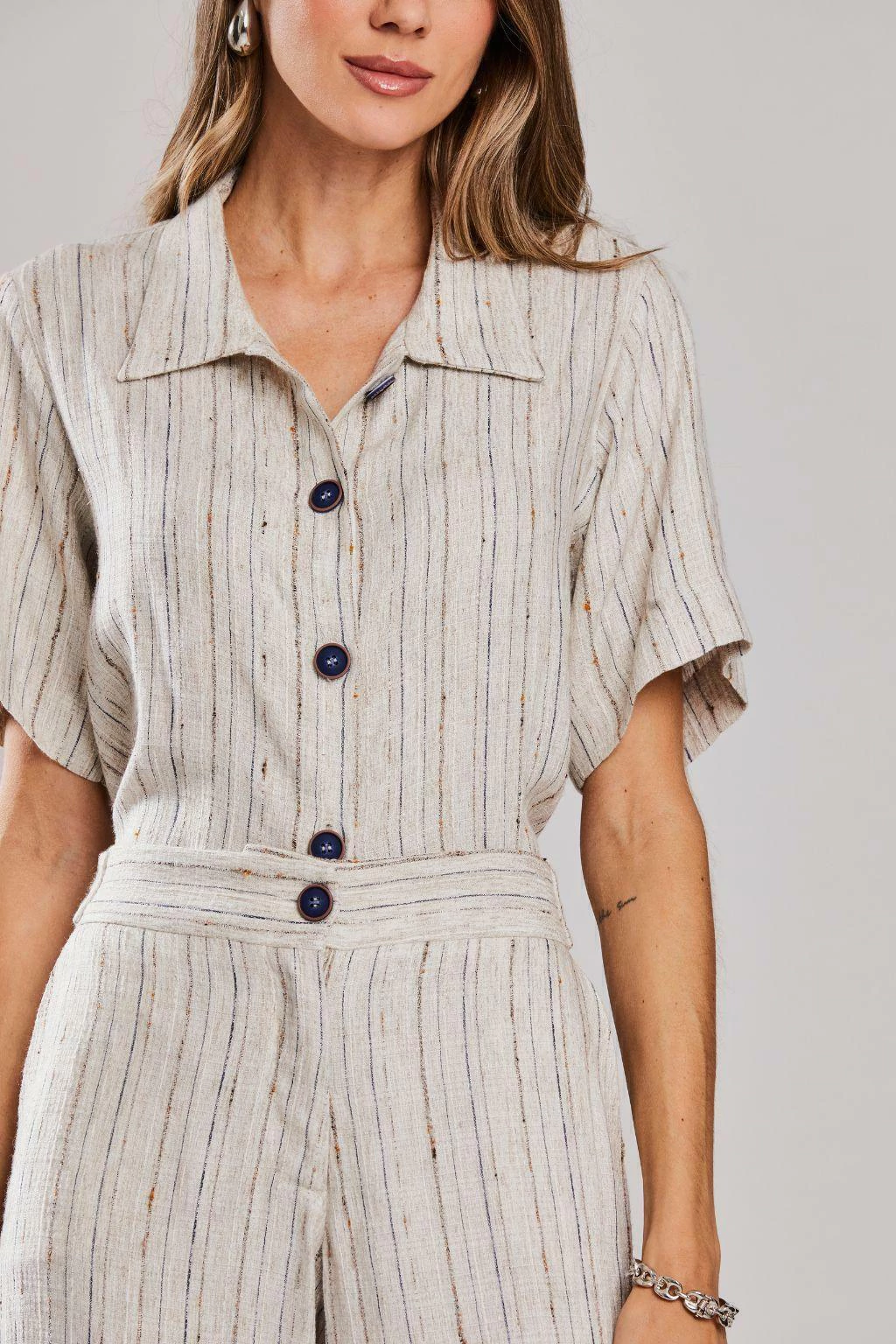 Para um look sofisticado, combine a Calça Alfaiataria Listrada Melua Única com uma blusa de seda e sapatos de salto. Para um visual mais casual, experimente usar com uma camiseta básica e tênis brancos. Adicione acessórios minimalistas para um toque moderno e chic.