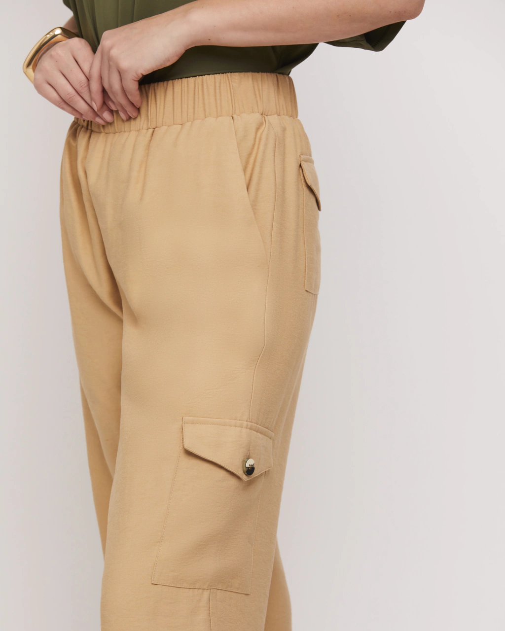 A Calça Cargo Confort Bege da Rubinella une o estilo moderno à funcionalidade, oferecendo conforto e sofisticação em uma única peça. Confeccionada em alfaiataria de viscose Helena, possui modelagem reta, bolso cargo lateral com aba e cós elástico para um ajuste perfeito. O comprimento versátil e os detalhes utilitários tornam esta calça ideal para looks casuais ou sofisticados, dependendo da composição.