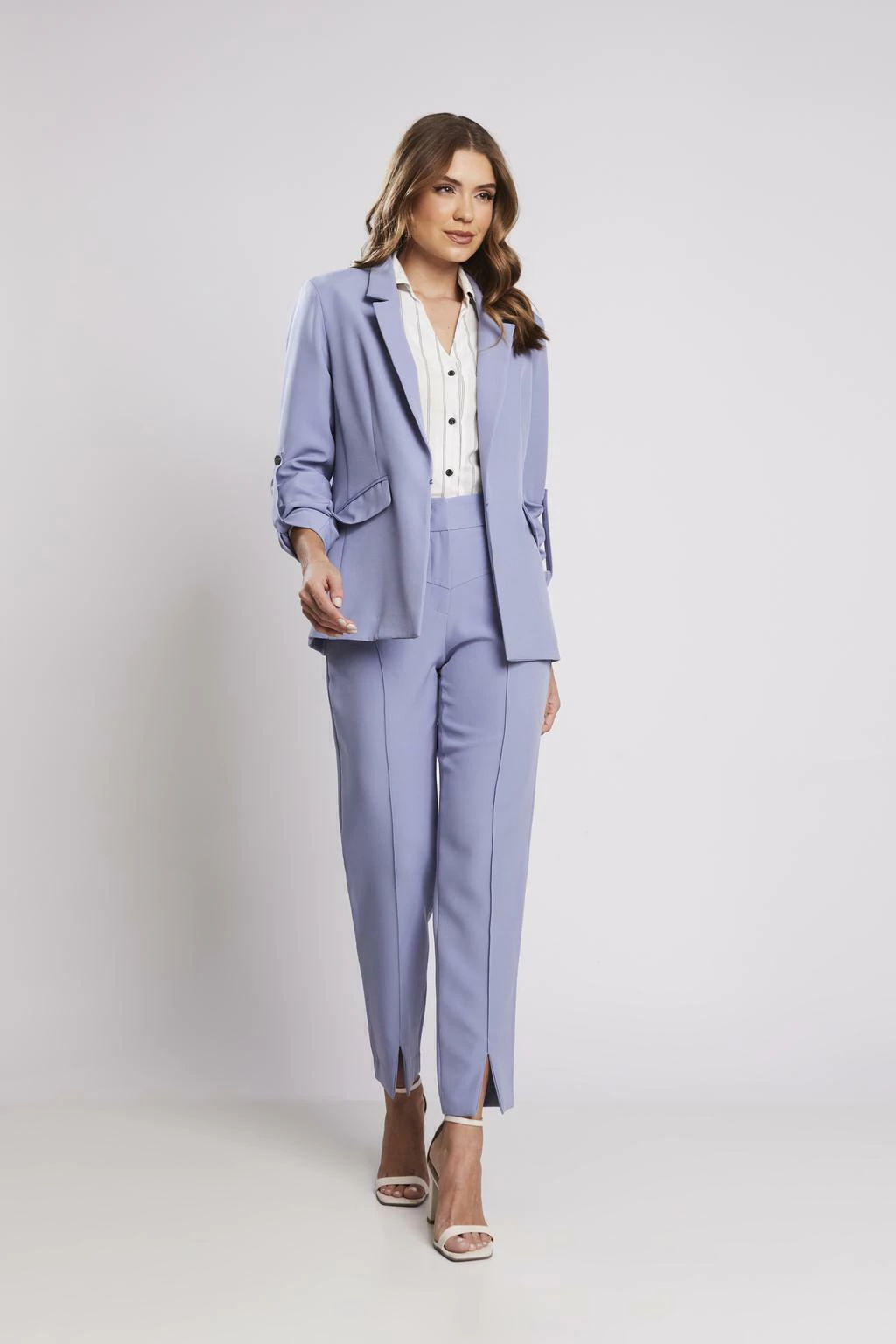 Combine a Calça Fenda Frontal Azul Bebê com uma blusa de alfaiataria para um look sofisticado, ou opte por uma blusa básica para um visual mais casual e descontraído. Complete o look com um par de saltos altos para um efeito ainda mais elegante e moderno.