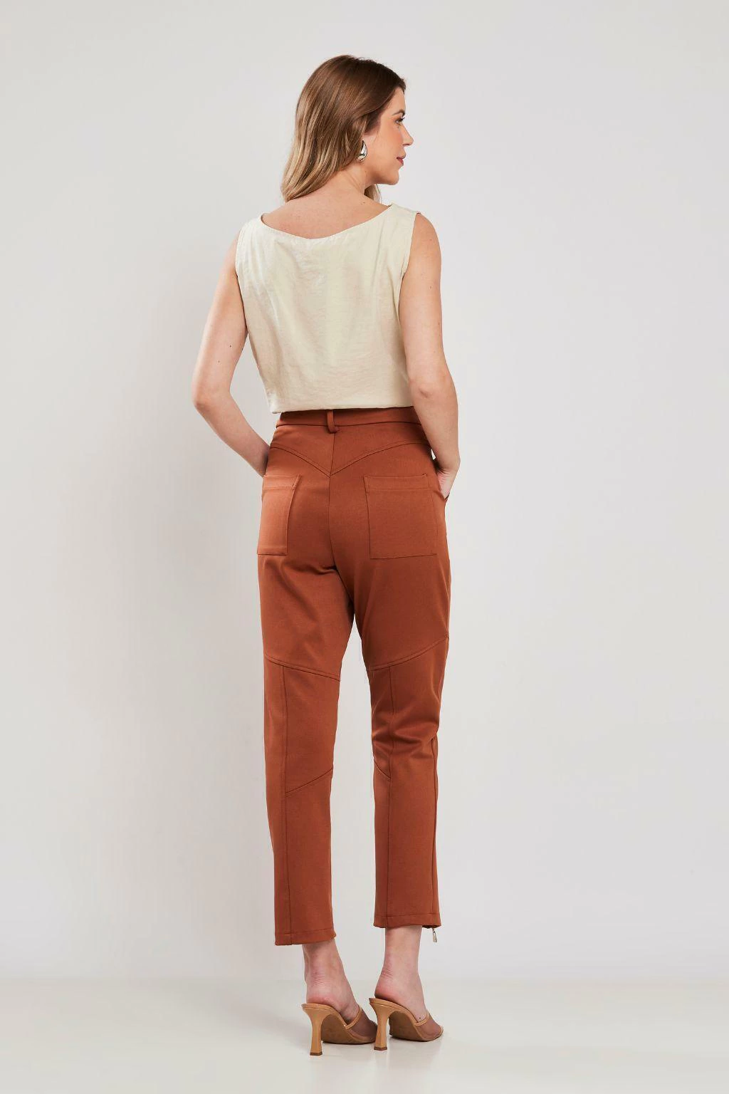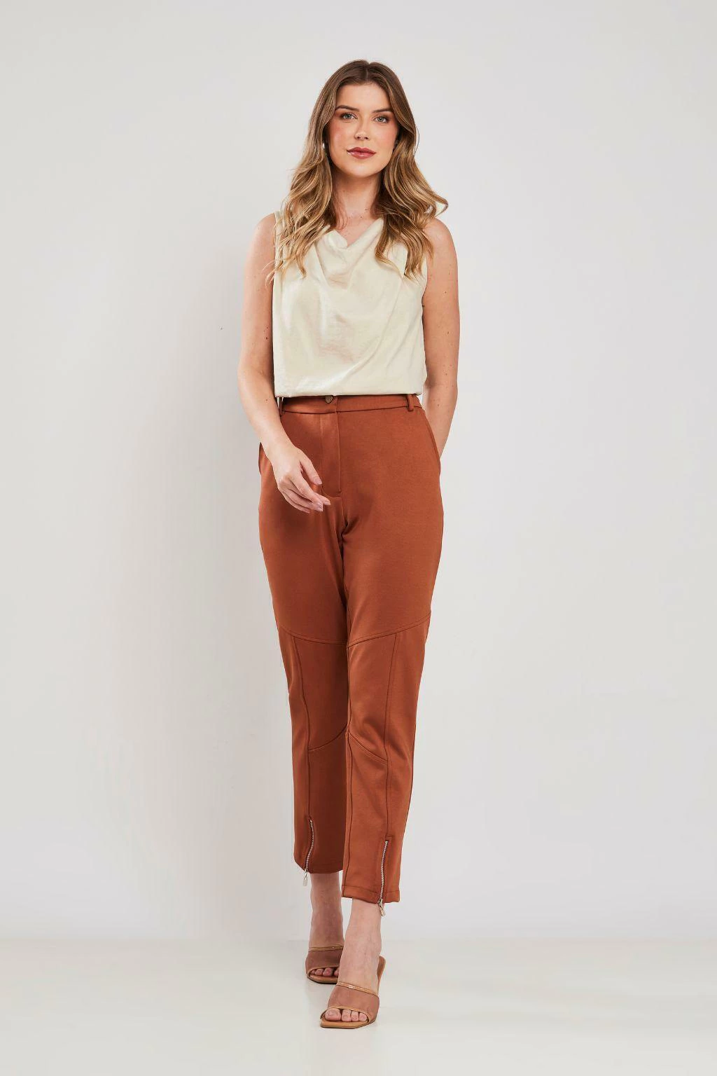 Combine a Calça Fenda Recortes Roma Cognac com uma blusa de seda e um blazer para um look de trabalho sofisticado. Para uma produção mais casual, opte por uma camiseta básica e tênis brancos, criando um contraste moderno e despojado. Os zíperes nas barras permitem que você ajuste o caimento conforme a ocasião, tornando a peça ainda mais versátil.