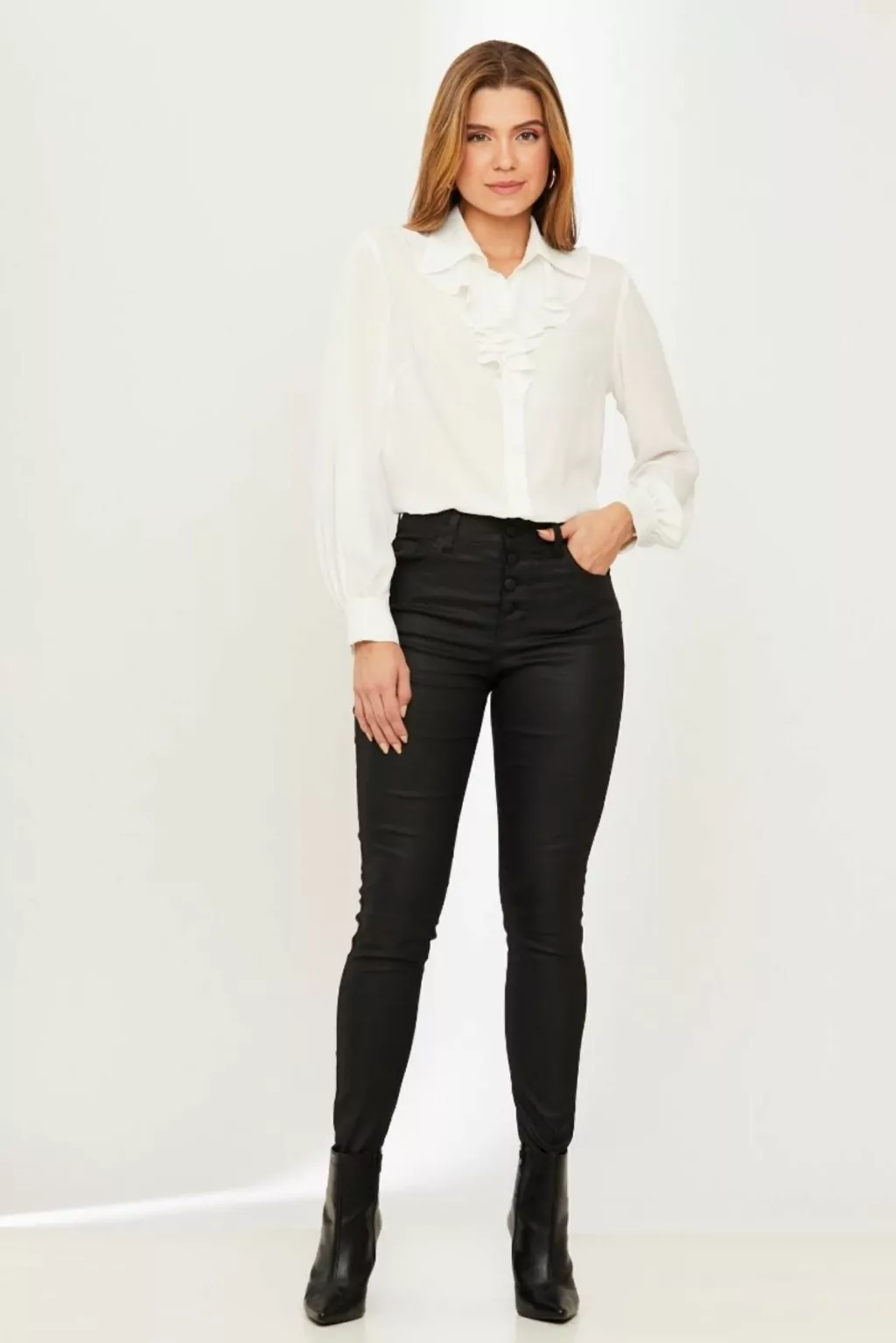 A Calça Jeans Skinny Preto é confeccionada com uma mistura de algodão, poliéster e elastano, garantindo uma peça durável e confortável. O couro resinado confere um aspecto moderno e sofisticado, enquanto a elasticidade do tecido proporciona um ajuste perfeito ao corpo, permitindo liberdade de movimento durante todo o dia.