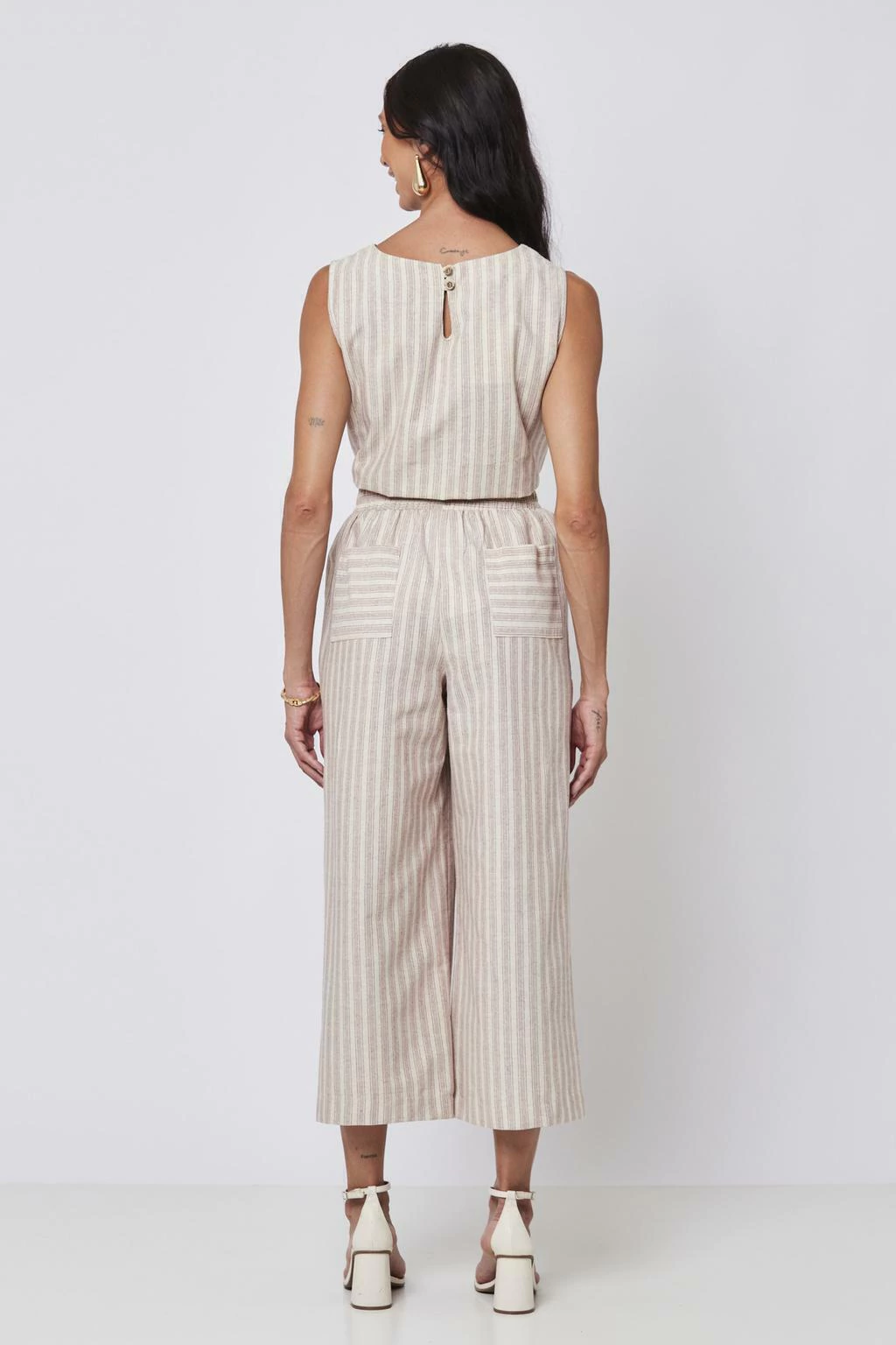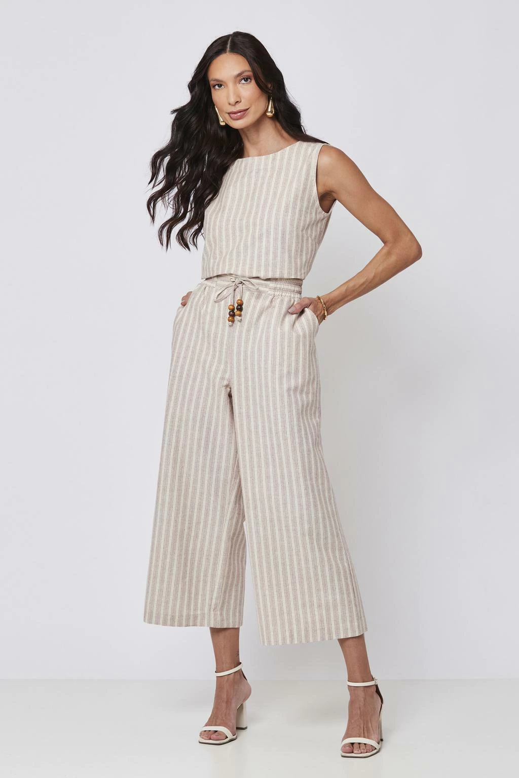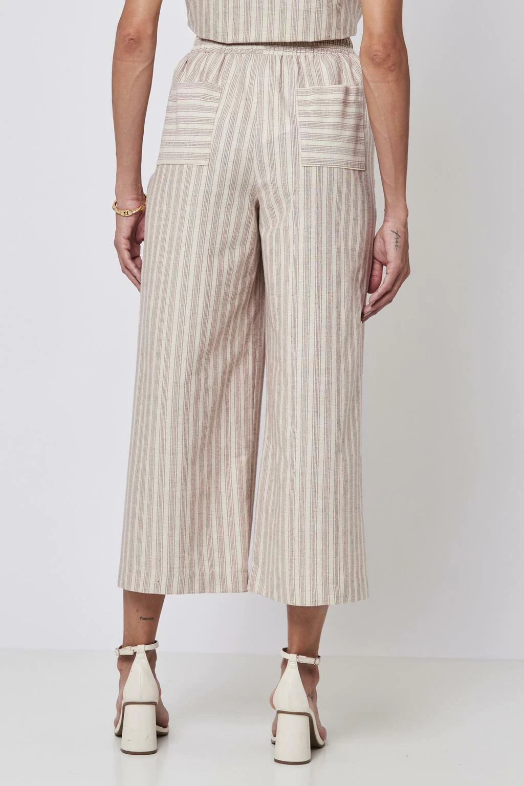 Combine a Calça Pantacourt Listras Vinho com uma blusa de alfaiataria para um look sofisticado, ou use-a com uma blusa básica para um visual casual e descontraído. Para um toque mais ousado, experimente acessórios em tons neutros que complementem as listras da calça.