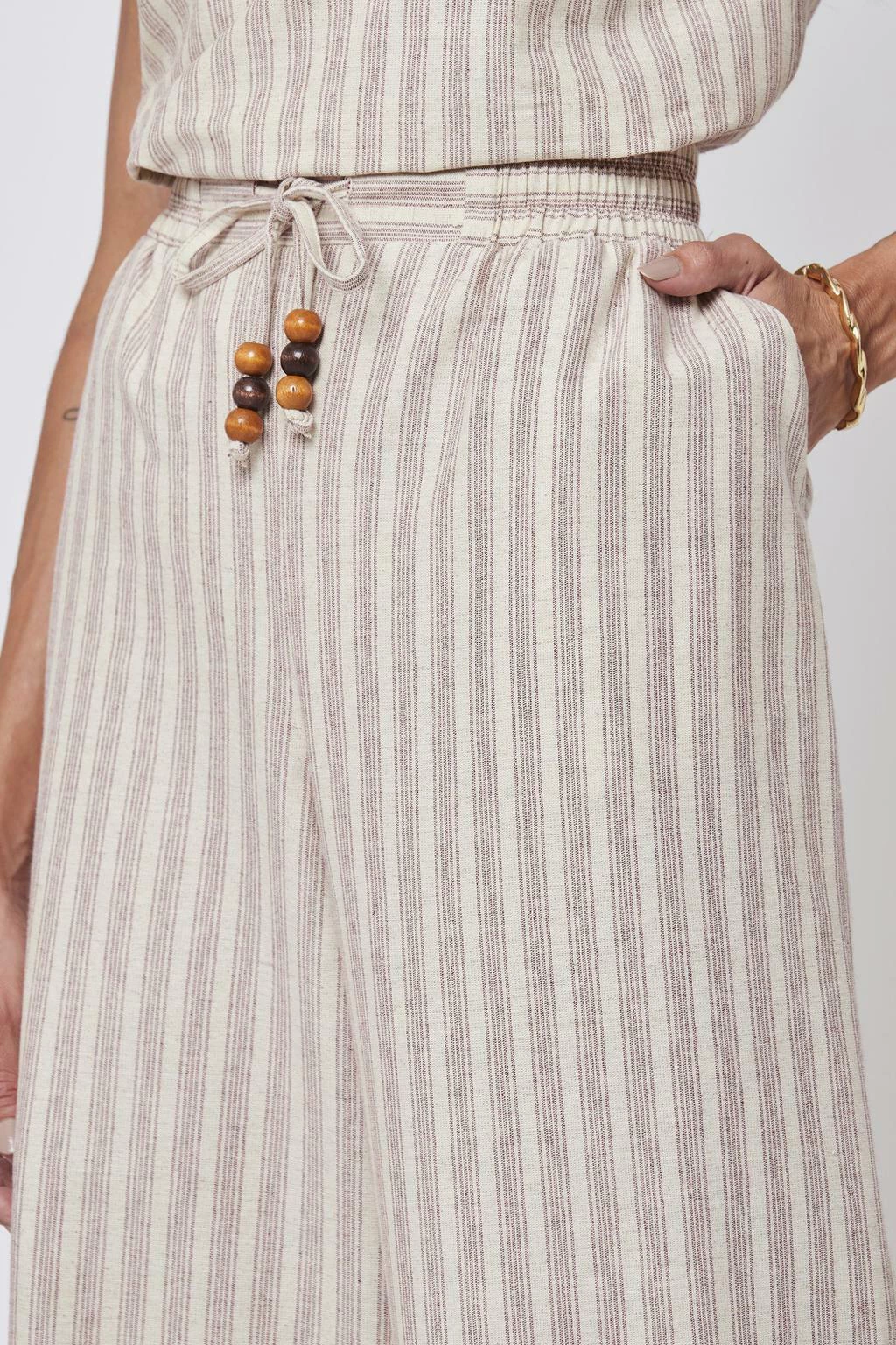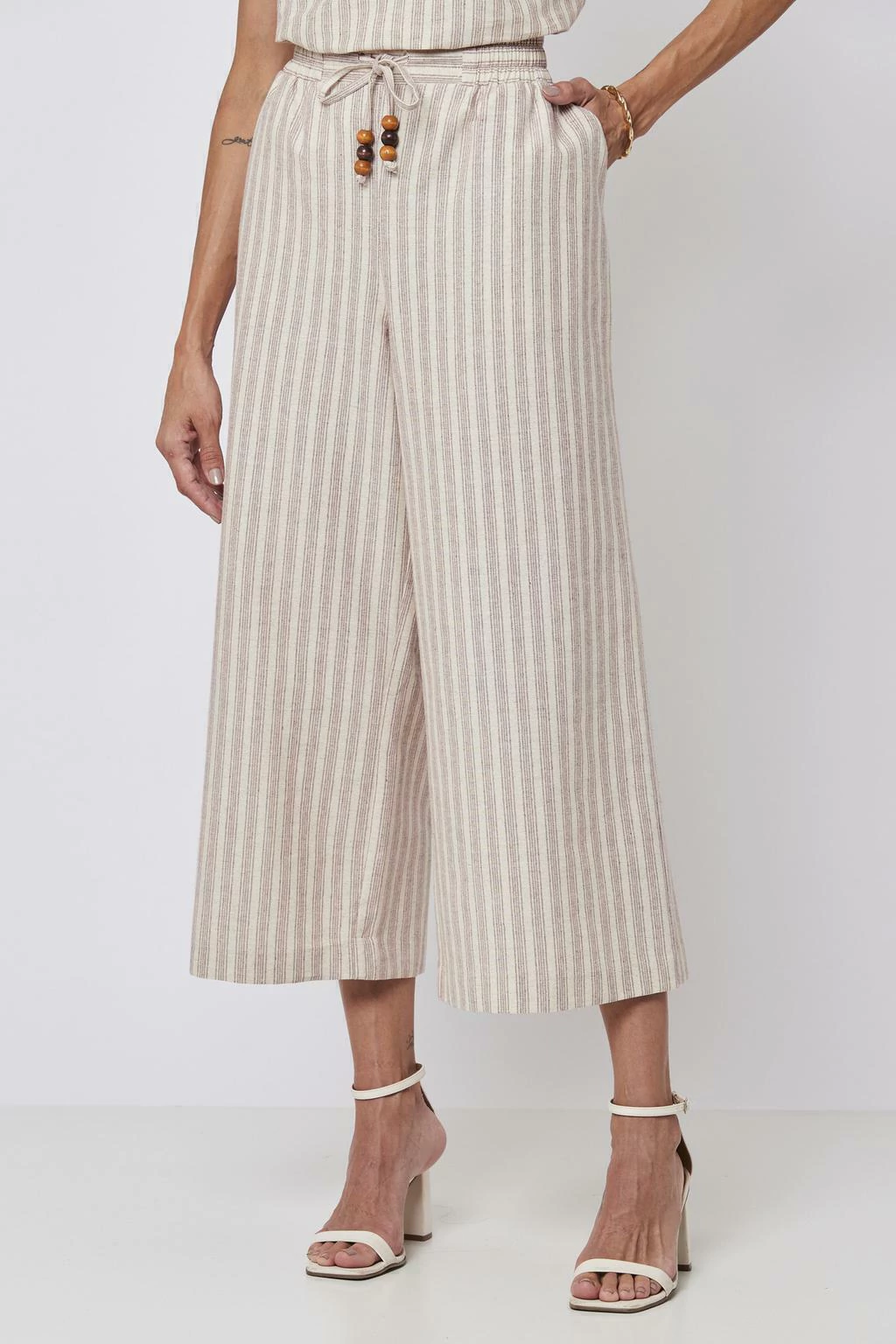 A Calça Pantacourt Listras Vinho da Rubinella é a peça perfeita para quem busca um visual sofisticado e moderno. Com um design que combina conforto e estilo, esta calça pantacourt é confeccionada em uma mistura de 67% algodão, 27% linho e 6% seda, garantindo um toque suave e uma excelente respirabilidade. As listras na cor vinho adicionam um charme especial, enquanto o elástico no cós e o roletê adornado com ponteiras em tons amadeirados proporcionam um ajuste confortável e elegante.