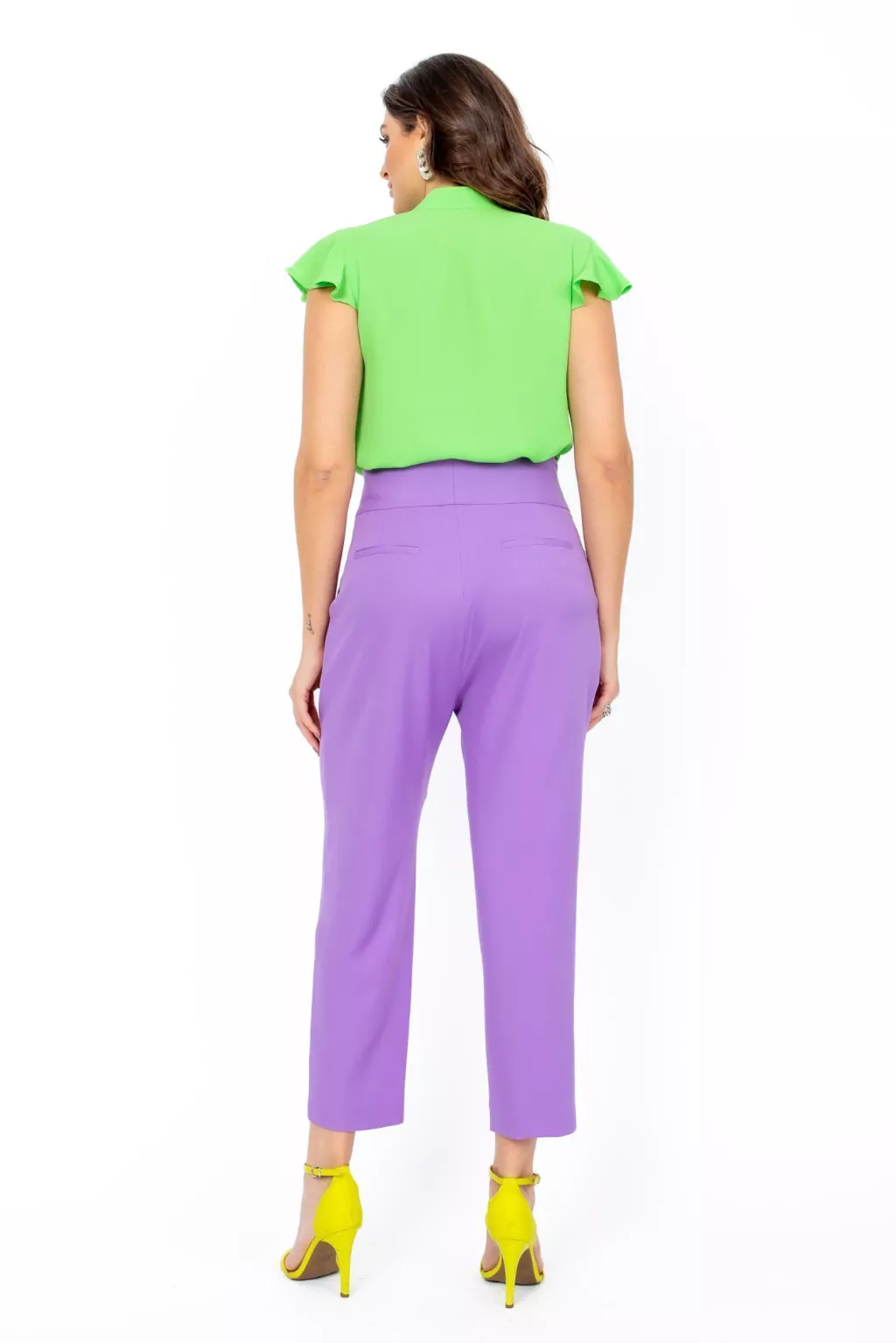 Combine a Calça Pastel Colors Lilás com blusas de tons neutros ou vibrantes para criar um visual equilibrado e moderno. Sandálias ou scarpins são ideais para completar o look com elegância, sendo perfeita para ocasiões casuais ou formais.