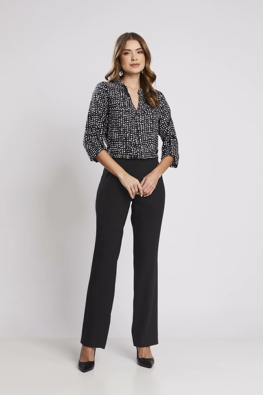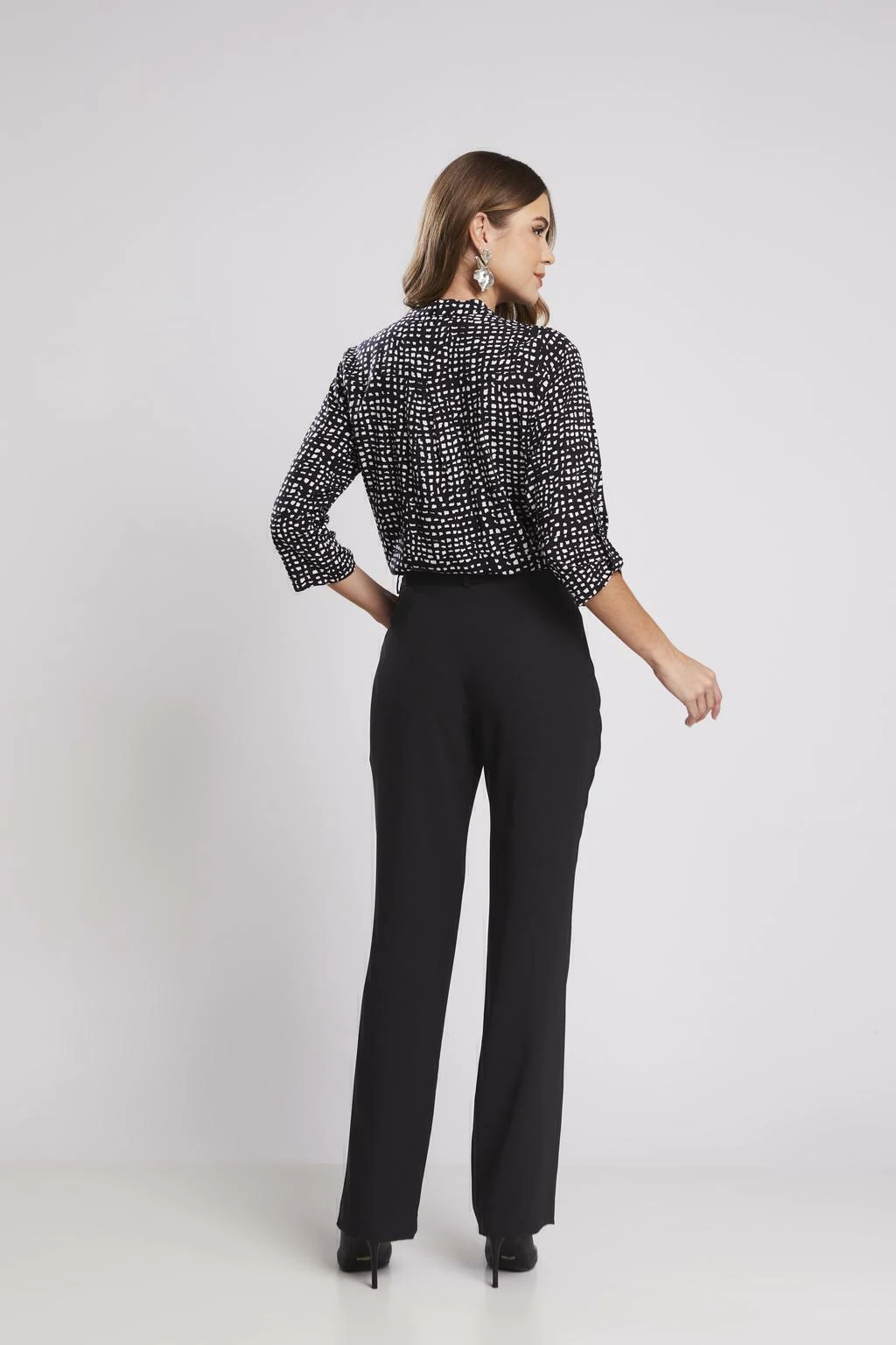 Combine a Calça Reta Preto com uma camisa de alfaiataria para um look profissional e sofisticado, ou opte por uma blusa casual para um visual descontraído. Para complementar, use um blazer estruturado e sapatos de salto para um toque de elegância, ou tênis brancos para um estilo mais casual e moderno.