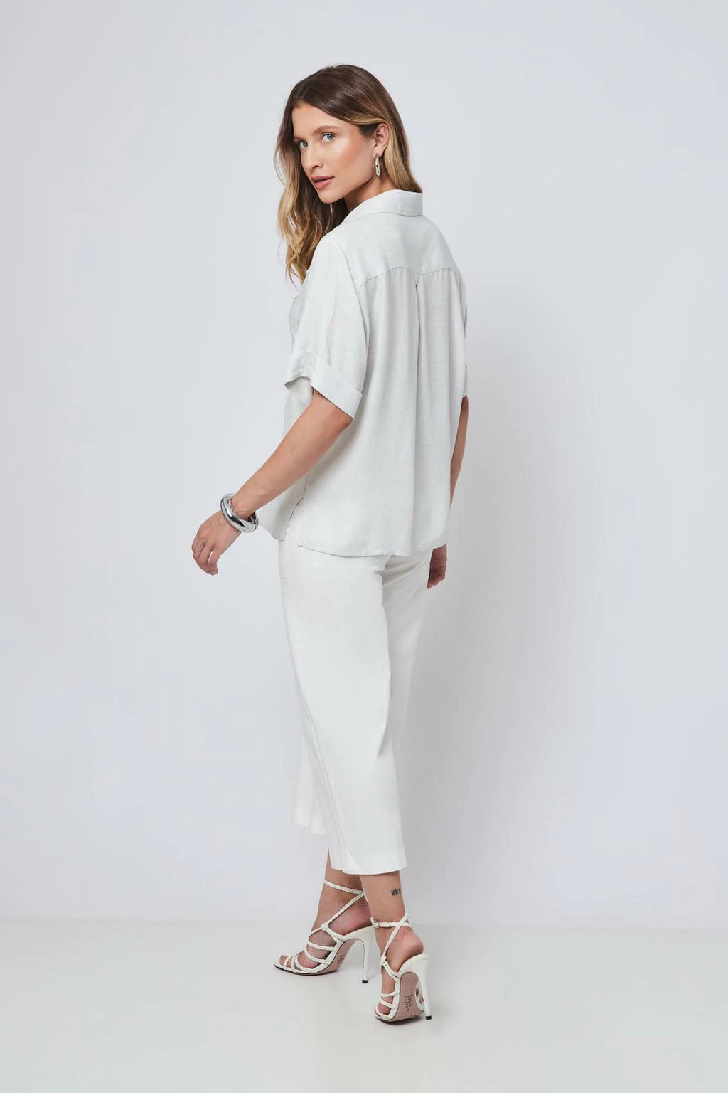 Combine a Camisa Manga Curta Única com calças de alfaiataria para um look profissional, ou opte por calças leves para um visual mais descontraído. Adicione um short ou uma saia para um toque ainda mais casual e fresco.