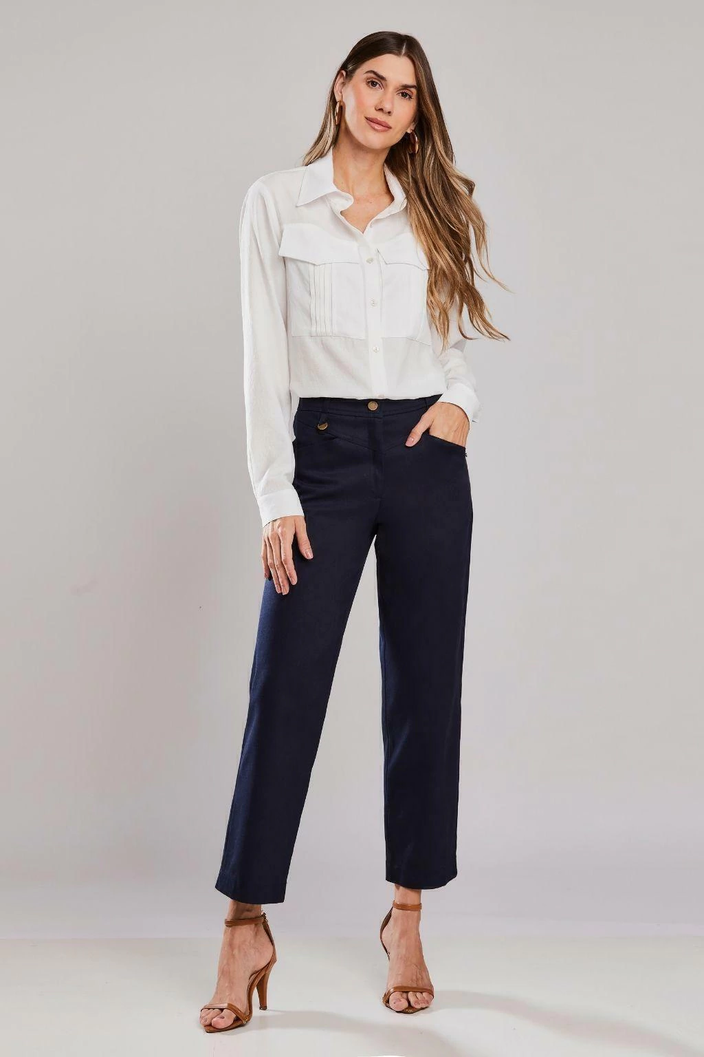 Para um look de trabalho, use a Camisa Utilitária Slub Off White com uma calça de alfaiataria escura e sapatos de salto. Para um passeio casual, combine-a com jeans e tênis brancos, finalizando com acessórios minimalistas para um toque moderno e despretensioso.