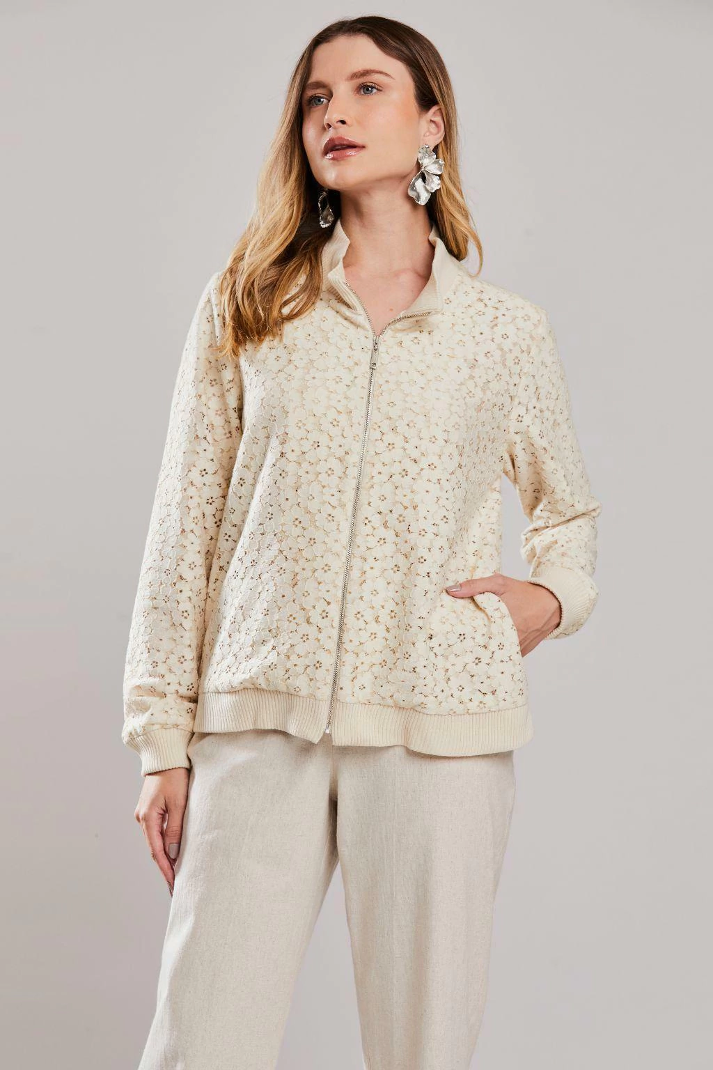 A Jaqueta Esportiva em Renda Evora Aveia da Rubinella é a escolha ideal para mulheres que desejam unir sofisticação e estilo em uma única peça. Adicione ao seu carrinho agora e destaque-se com esta jaqueta que é um verdadeiro must-have da coleção!
