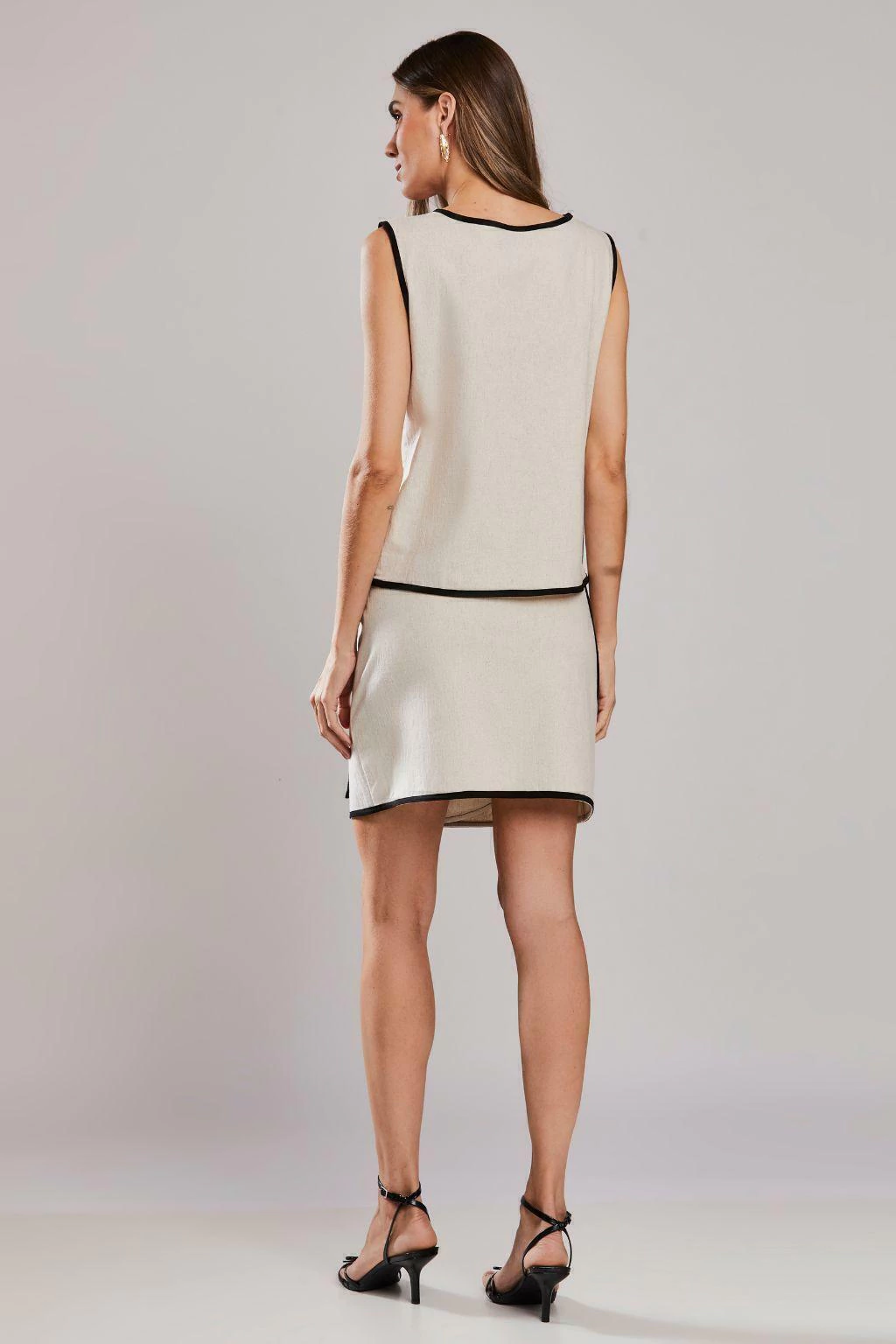 Para um look de trabalho, combine a Saia Laços Cotton Linen Areia com uma blusa de alfaiataria e sapatos de salto. Para um estilo mais casual, opte por uma camiseta básica e tênis brancos, criando um contraste moderno e despojado. Os acessórios minimalistas, como brincos de argola ou uma bolsa estruturada, complementam o visual de forma harmoniosa.