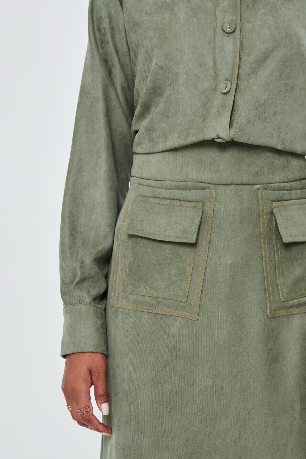 Saia Midi Evasê Cotelê Musgo 223 da Rubinella, um clássico contemporâneo que combina elegância e conforto.