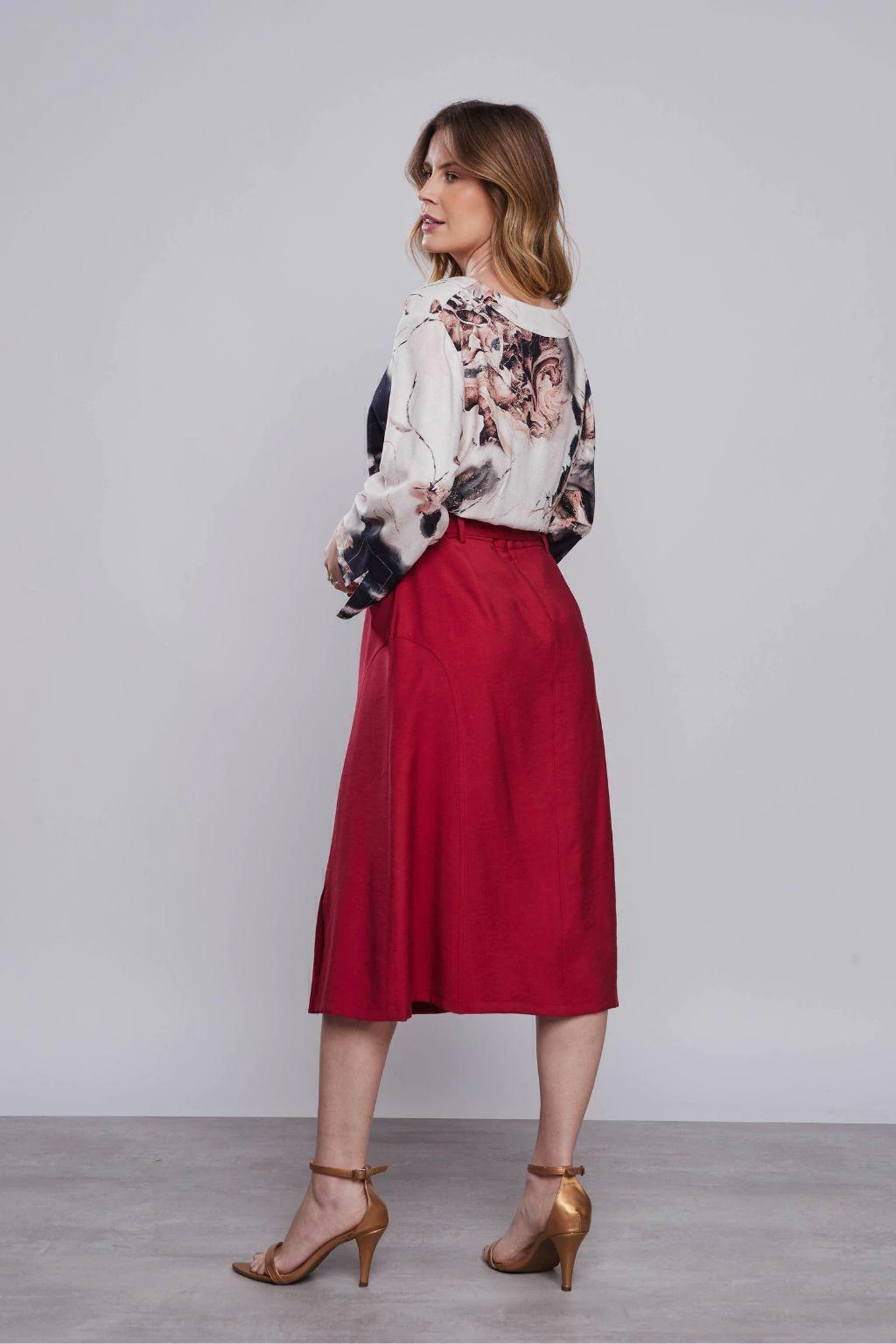 Combine a Saia Midi Fendas Vinho com uma blusa de alfaiataria para um look sofisticado, ou use-a com uma t-shirt básica para um visual mais casual e despojado. Complete o look com sandálias de salto para um toque elegante.
