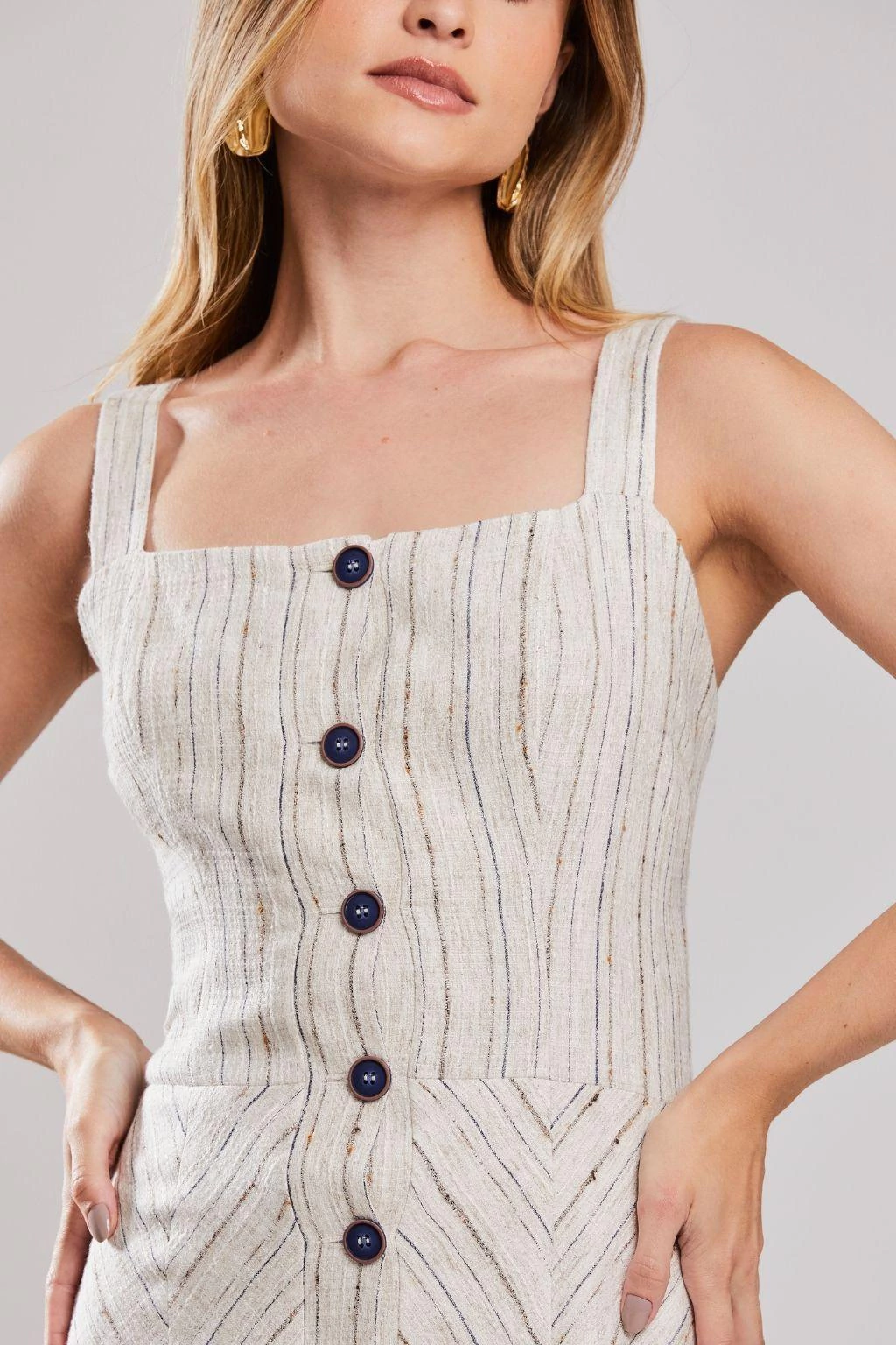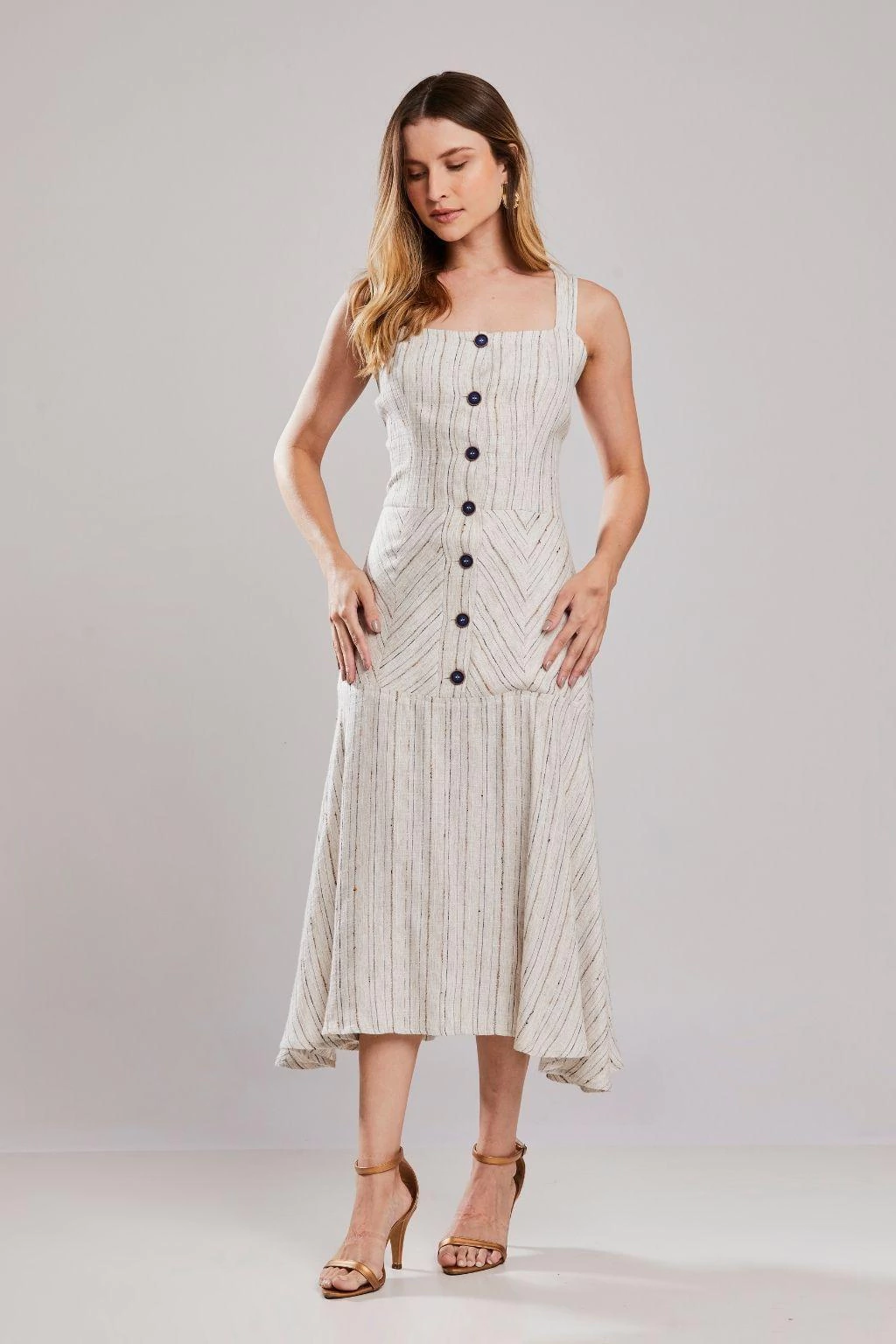 O Vestido Alongado Alfaiataria Melua Única da Rubinella é a escolha perfeita para os dias quentes de verão, unindo elegância e conforto em uma única peça. Confeccionado em um tecido leve de tom natural, este vestido apresenta um jogo harmonioso de listras verticais e horizontais que valoriza a modelagem, acrescentando um toque de sofisticação ao visual. Com alças finas e uma saia levemente rodada, o vestido proporciona leveza e movimento, ideal para quem busca um look fresco e moderno. O fechamento frontal por botões não só reforça o estilo contemporâneo, mas também garante praticidade no vestir, tornando-o uma peça versátil para diversas ocasiões.