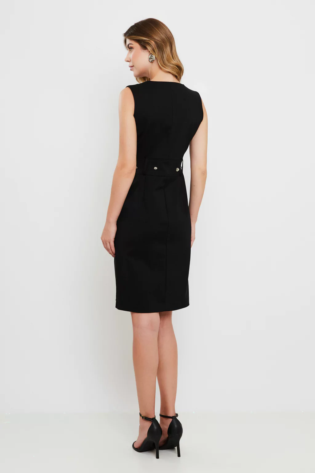 O Vestido Midi Alfaiataria Preto da Rubinella é a escolha perfeita para quem busca sofisticação e elegância em uma peça única. Com uma modelagem acinturada que valoriza a silhueta, este vestido é confeccionado em um tecido de alfaiataria de alta qualidade. O decote arredondado e o recorte na cintura, complementado por um cinto adornado com botões prateados de design irregular, garantem um visual moderno e sofisticado. Ideal para ocasiões formais e eventos especiais.