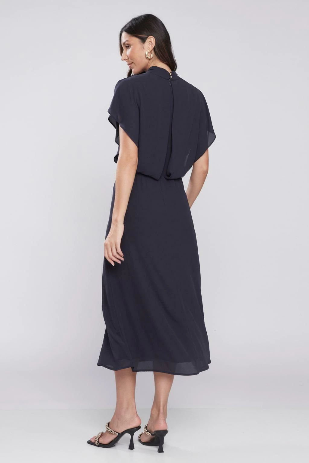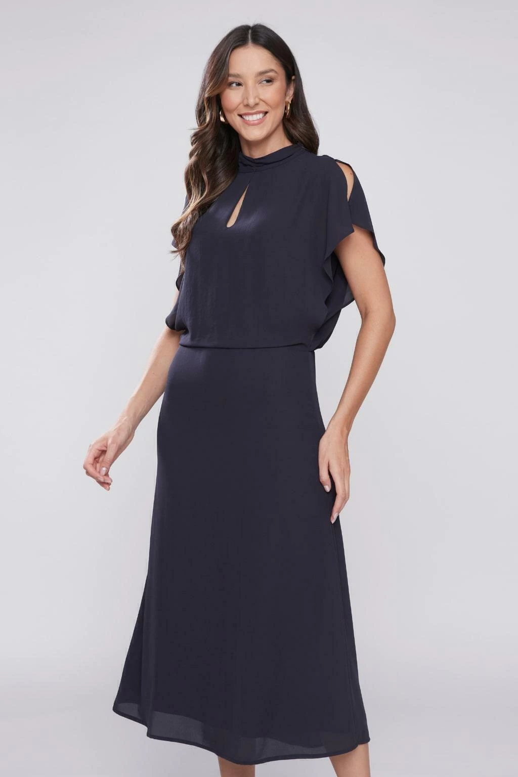 O Vestido Midi Evasê Marinho da Rubinella é a definição perfeita de sofisticação e conforto. Confeccionado em 100% poliéster de toque macio e leve, este vestido apresenta um caimento fluido com modelagem evasê que valoriza a silhueta com elegância. O forro na saia garante um conforto extra, enquanto as mangas trabalhadas em babados delicados conferem leveza e movimento à peça.
