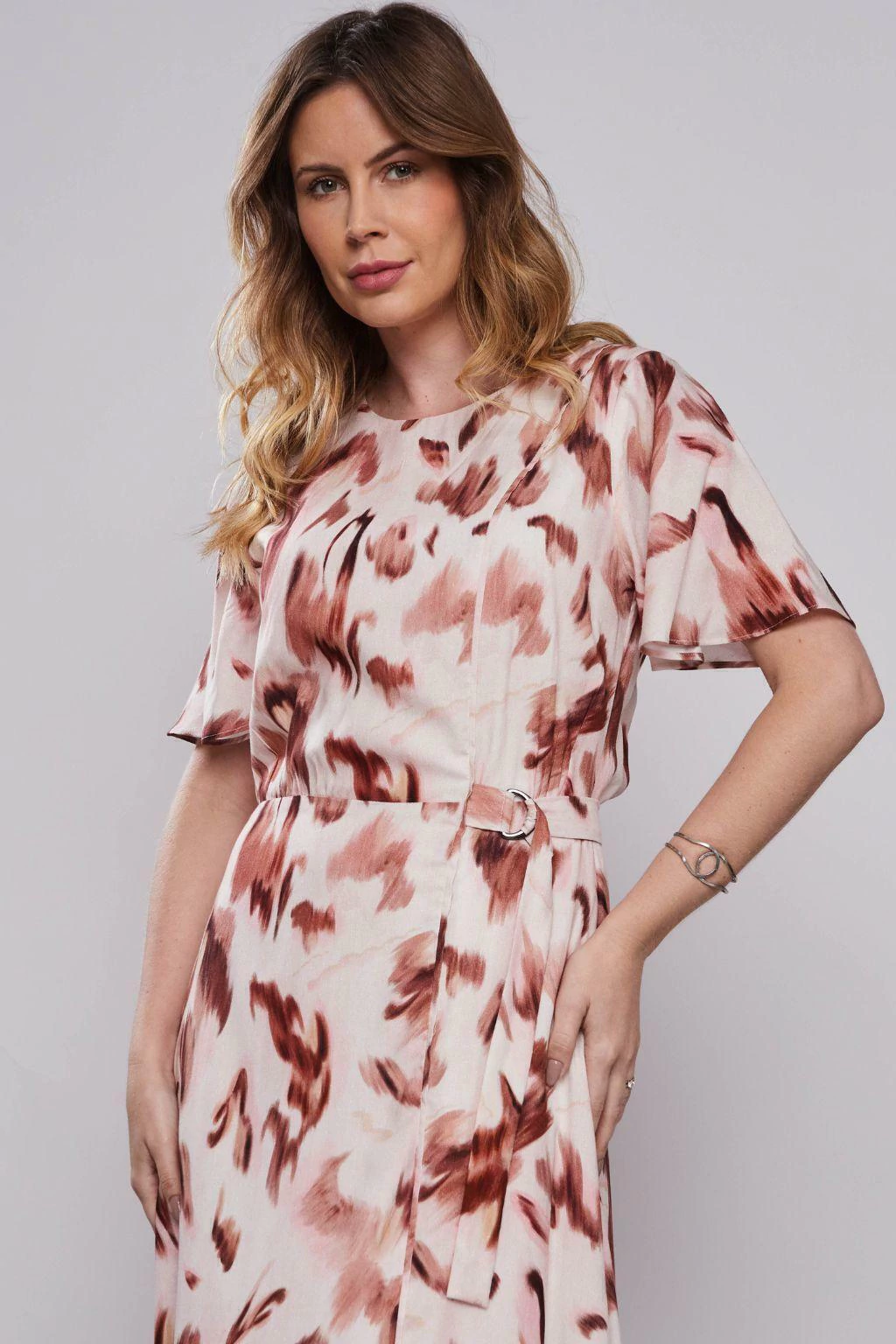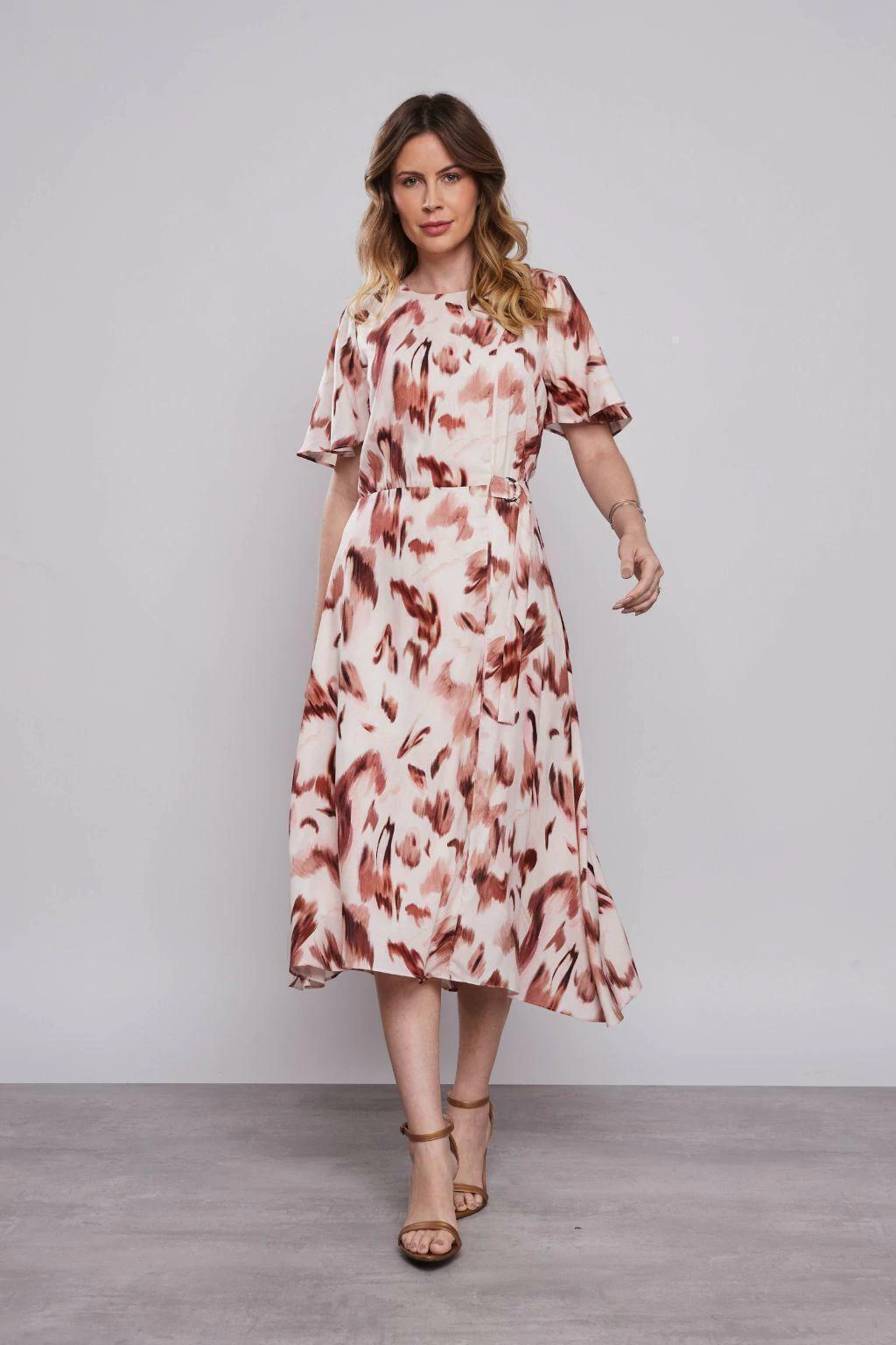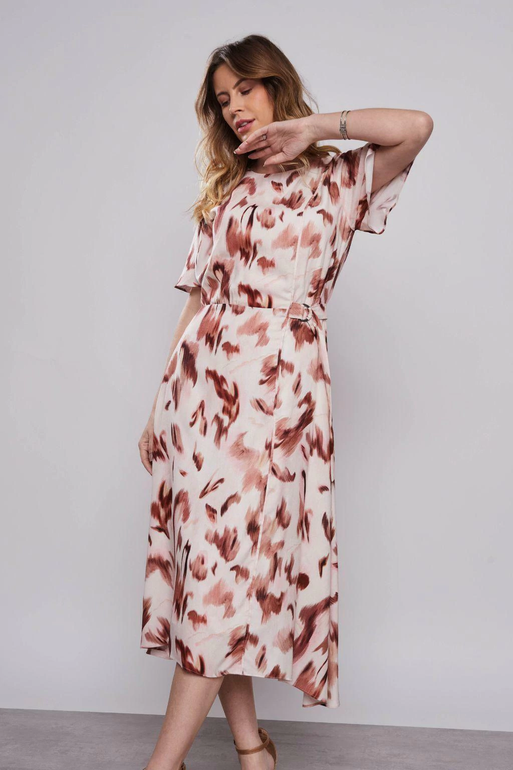 O Vestido Midi Evasê de Onça Aquarelada da Rubinella é a peça perfeita para mulheres que desejam unir feminilidade e ousadia com elegância. Confeccionado em viscose maquinetada, o vestido apresenta uma leve textura e um caimento fluido que valoriza a silhueta de maneira sofisticada. A estampa de onça aquarelada confere um toque contemporâneo, enquanto a barra assimétrica e o cinto embutido com argolas metálicas adicionam charme e personalidade ao visual. O fechamento com zíper traseiro garante praticidade, tornando este vestido uma escolha marcante para ocasiões especiais ou produções com atitude.