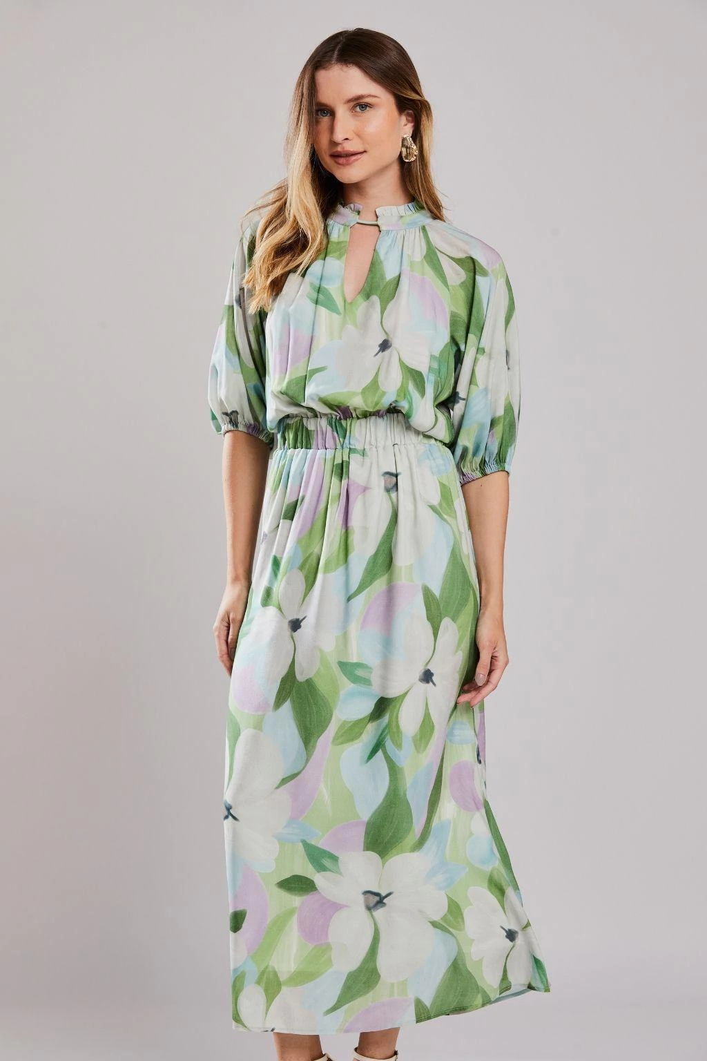 O Vestido Midi Floral Cascais Unica da Rubinella é a tradução perfeita do romantismo leve e sofisticado. Com uma estampa floral delicada que exala frescor e elegância, este vestido valoriza a feminilidade em cada detalhe. O elástico na cintura proporciona um ajuste confortável e define a silhueta de forma graciosa, enquanto as mangas curtas bufantes com punho franzido adicionam um toque de volume sutil e charme atemporal.