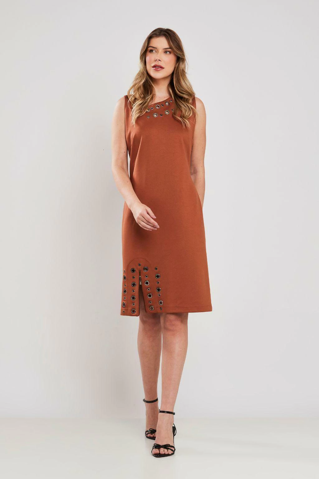 O Vestido Midi Ilhoses Cognac da Rubinella é a escolha perfeita para quem busca elegância com personalidade. Confeccionado em malha Ponto Roma Plus, este vestido apresenta uma modelagem acinturada que valoriza a silhueta, oferecendo conforto e estrutura em cada movimento. O decote assimétrico dá um toque moderno e ousado, enquanto os ilhoses metálicos em diferentes tamanhos, aplicados com arte na região do busto e da barra, adicionam um charme especial e sofisticado à peça.