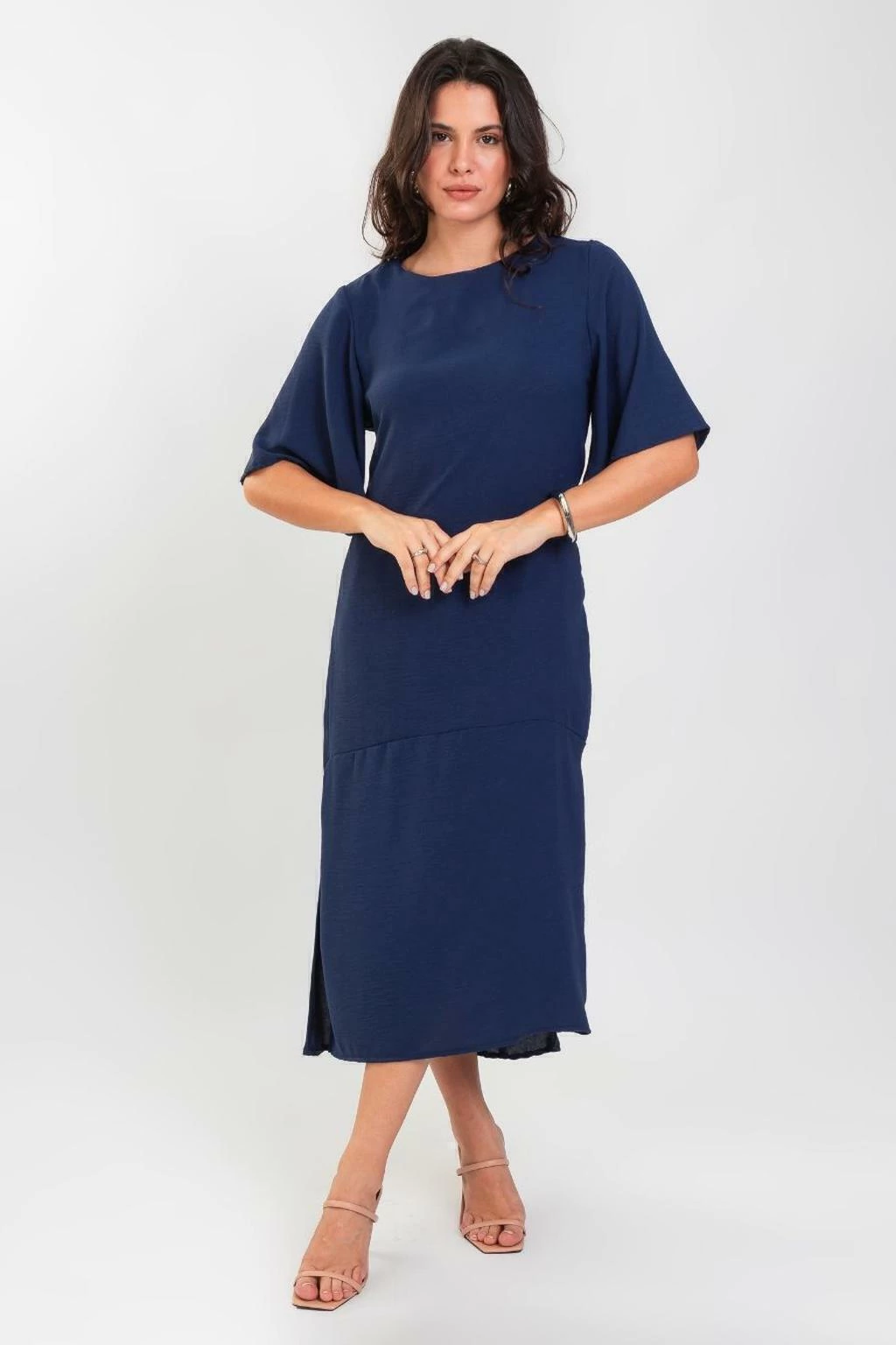 Combine o Vestido Midi Mangas Amplas Marinho com sandálias de salto para um look sofisticado ou com tênis brancos para um visual casual e descontraído. Acessórios minimalistas são ideais para complementar a produção sem sobrecarregar o visual.